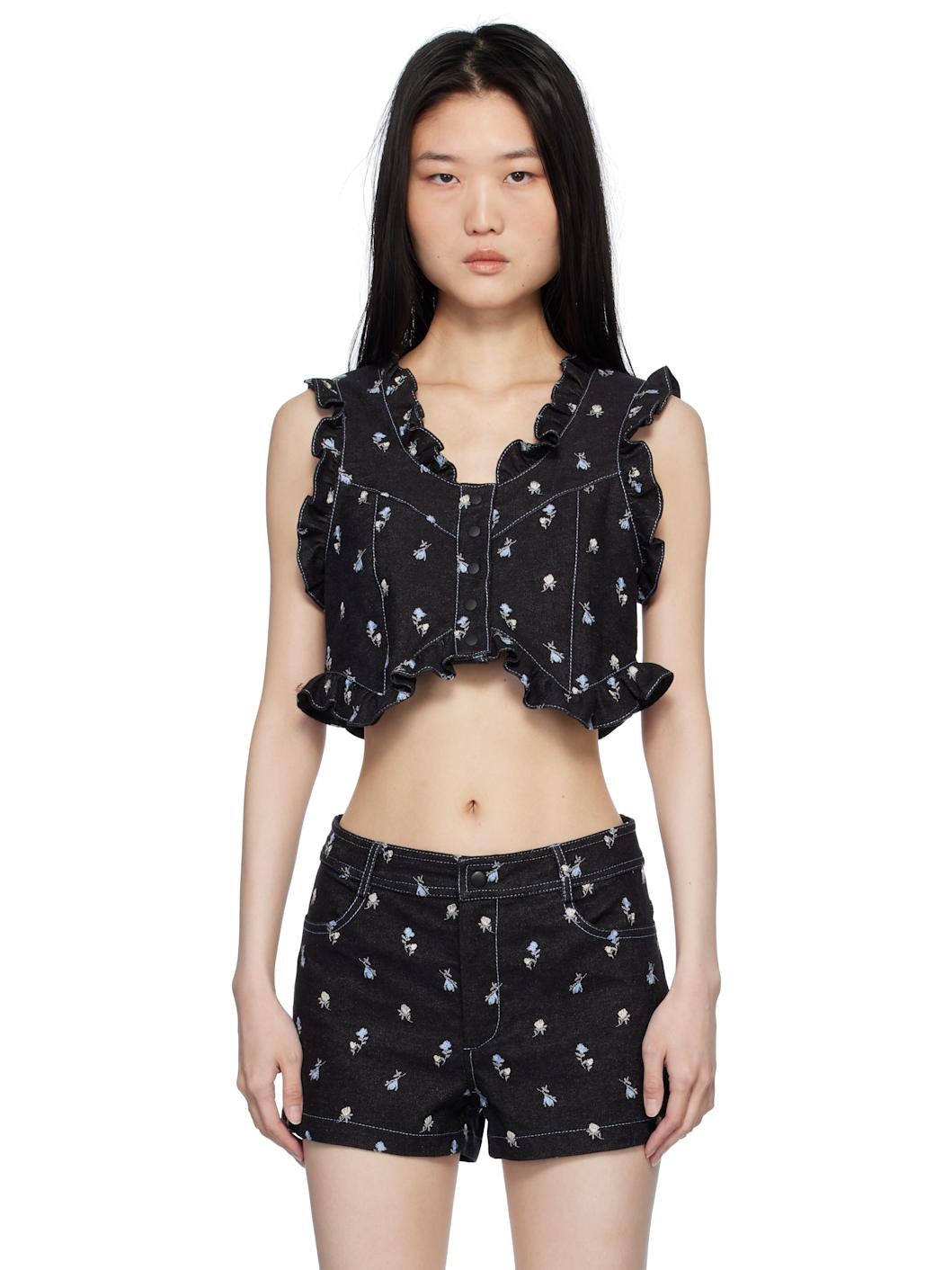 Non-stretch denim vest. Ruffled trim and floral pattern embroidered throughout. · Scoop neck · Press-stud closure · Curved cropped hem · Contrast stitching in blue Supplier color: Black/Multi Body: 100% cotton. Trim: 100% polyester. Made in United States 251894F111005