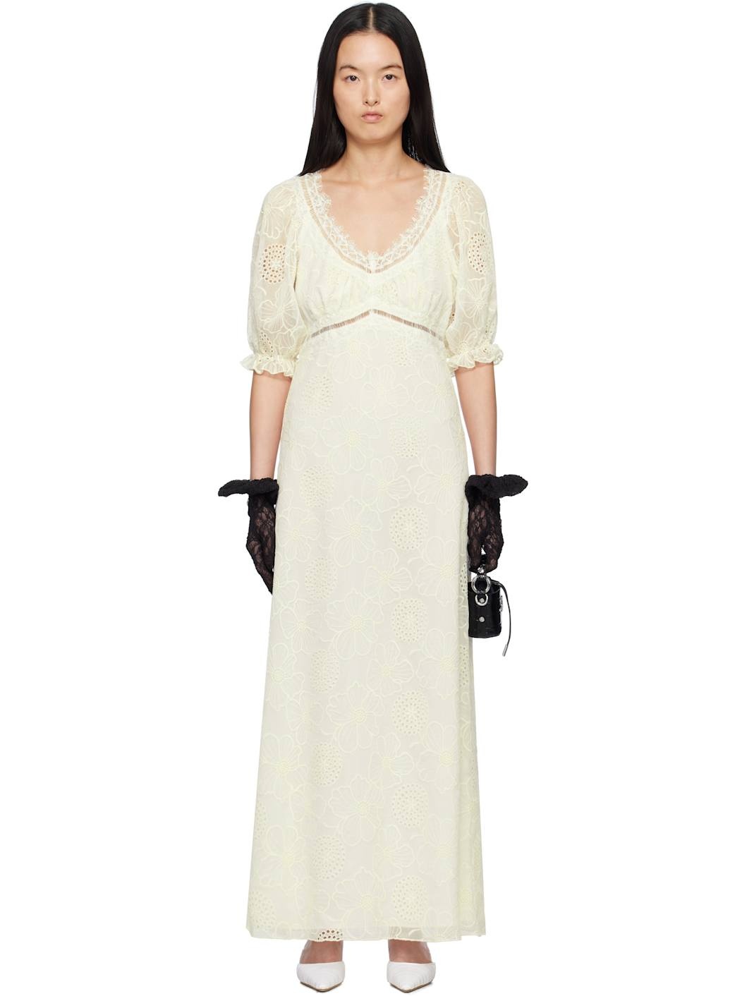 Semi-sheer polyester broderie anglaise maxi dress. Lace trim throughout. · Scoop neck · Puff sleeves · Concealed zip closure at back collar · Partial crepe lining Supplier color: Vanilla Body: 100% polyester. Lining: 100% polyester. Made in United States 251894F055000
