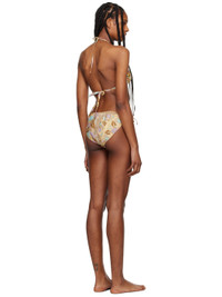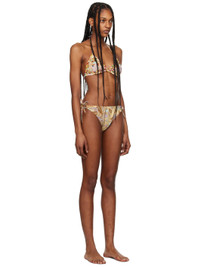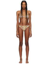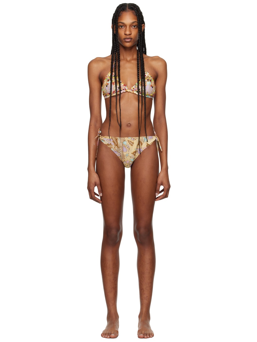 Cotton jersey bikini top. Beaded detailing and graphic pattern printed throughout. · Plunging V-neck · Self-tie halter strap and straps at back · Full stretch mesh lining Cotton jersey bikini bottom. Graphic pattern printed throughout. · Elasticized waistband and cuffs · Self-tie fastening at side seams · Partial stretch mesh lining Supplier color: Cantaloupe multi Body: 100% cotton. Lining: 80% polyester, 20% spandex. Made in United States 241894F105002
