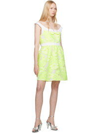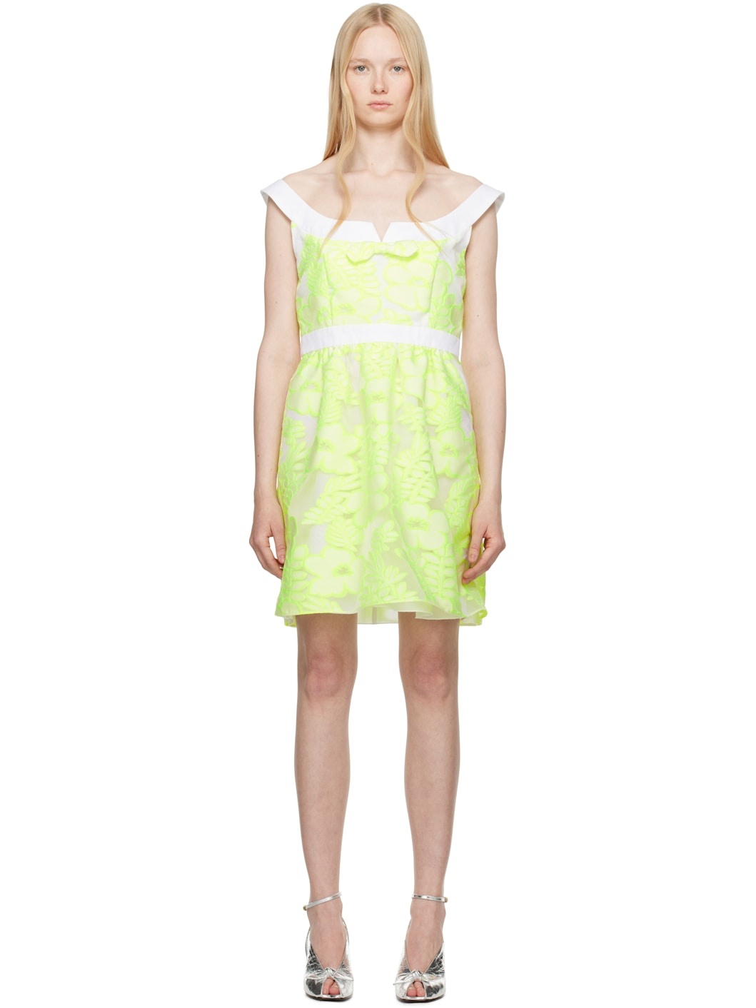 Viscose-blend tulle and cotton twill minidress. Jacquard floral pattern throughout. · Off-the-shoulder construction · Bow accent at scoop neck · Gathering at waist · Concealed zip closure at back · Polyester poplin lining Supplier color: Fluorescent yellow Body 1: 60% viscose, 27% polyester, 13% nylon. Body 2: 100% cotton. Lining: 100% polyester. Made in United States 251894F052009