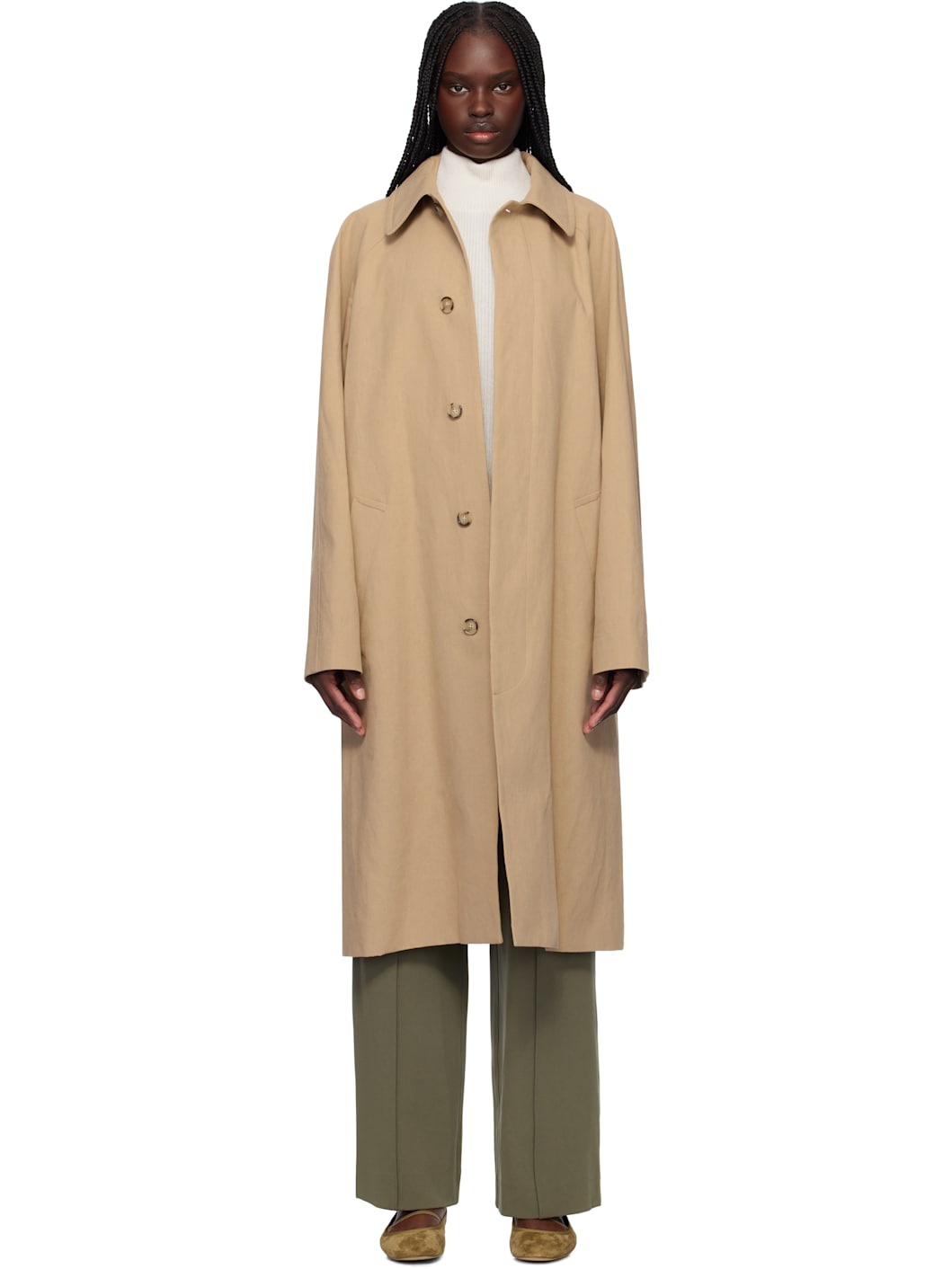 Cotton- and linen-blend hopsack trench coat. · Spread collar · Concealed button closure · Welt pockets · Raglan sleeves · Central vent at back hem · Welt pocket at interior · Full twill lining Supplier color: Dark beige Body: 76% cotton, 24% linen. Fill: 100% polyester. Lining 1: 100% cotton. Lining 2: 100% viscose. Made in Romania 251252F059003
