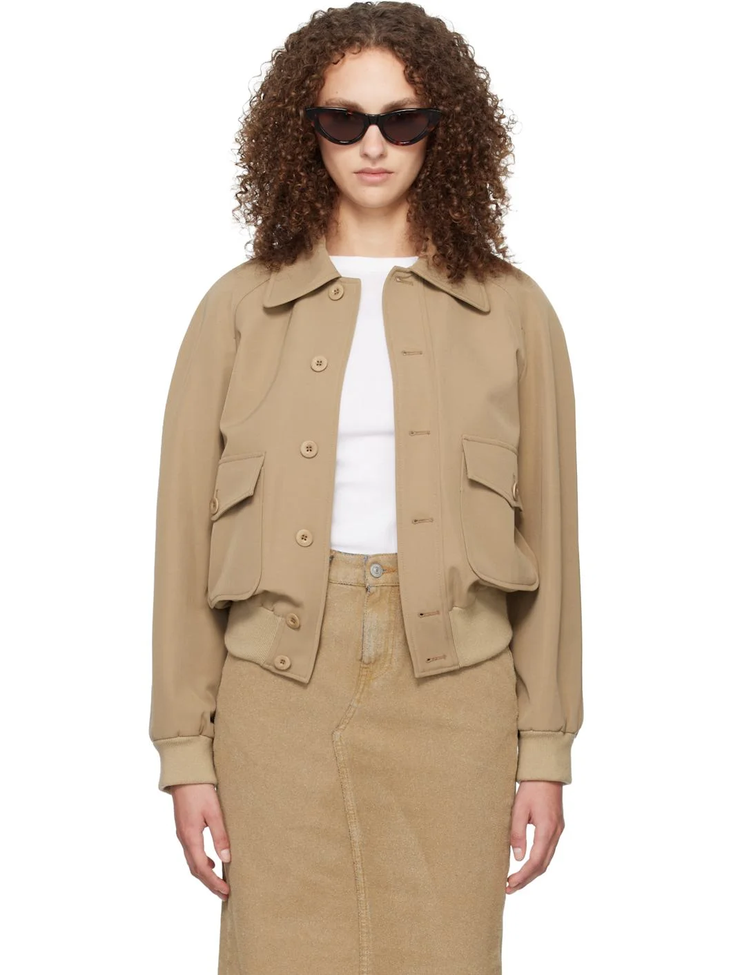 Stretch cotton- and wool-blend twill bomber jacket. · Spread collar · Button closure · Flap pockets at front · Rib-knit hem and cuffs · Raglan sleeves · Welt pocket at interior · Fully lined Supplier color: Beige Body: 44% cotton, 30% polyester, 24% wool, 2% elastane. Trim: 50% wool, 50% acrylic. Lining 1: 100% cotton. Lining 2: 100% viscose. Made in Bulgaria 261252F058001