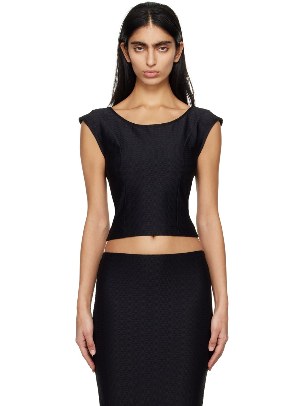 Textured stretch nylon jersey T-shirt. · Scoop neck · Cap sleeves Supplier color: Black 83% polyamide, 17% elastane. Made in Portugal 241252F110027