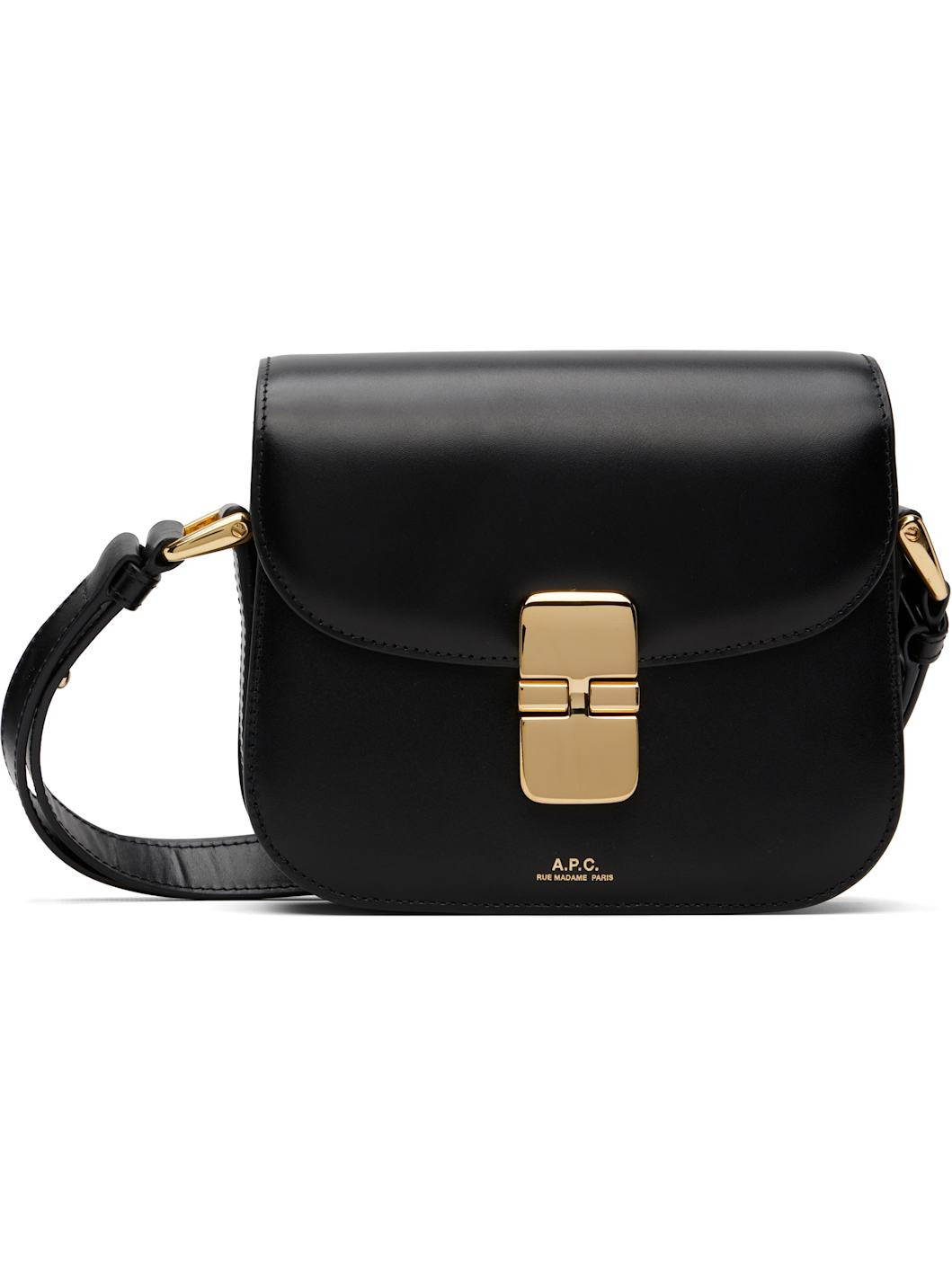 Buffed leather shoulder bag. · Adjustable crossbody strap · Gold-tone logo stamp at face · Concealed patch pocket at face · Tab-slot flap · Three-compartment interior · Cotton twill lining · Gold-tone hardware · H5.5" x W7" x D1.5" Supplier color: Noir Leather. Made in Morocco 252252F048017