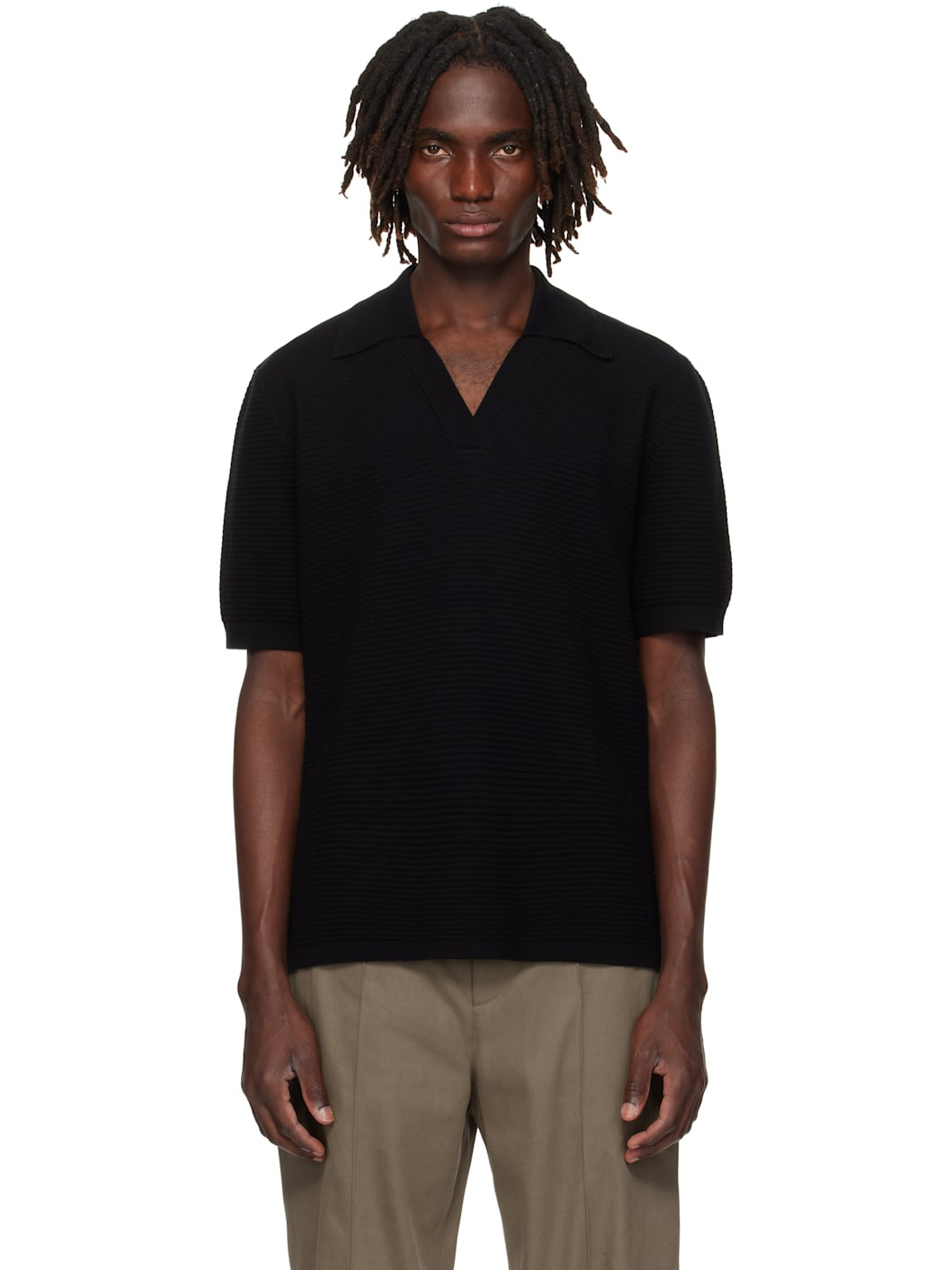 Knit cotton polo · Rib-knit open spread collar, cuffs, and hem · Tennis-tail hem Supplier color: Black 100% cotton. Made in Turkey 252252M212005