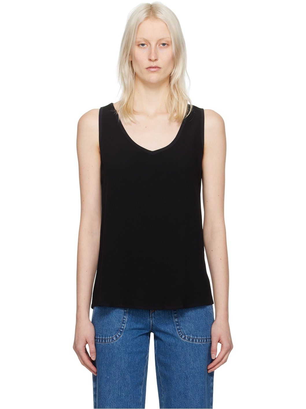 Viscose crepon tank top. Raw edge trim at scoop neck and armscyes. Supplier color: Black 100% viscose. Made in Tunisia 241252F111000