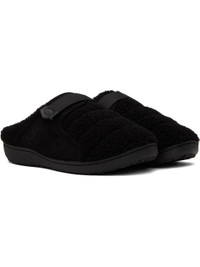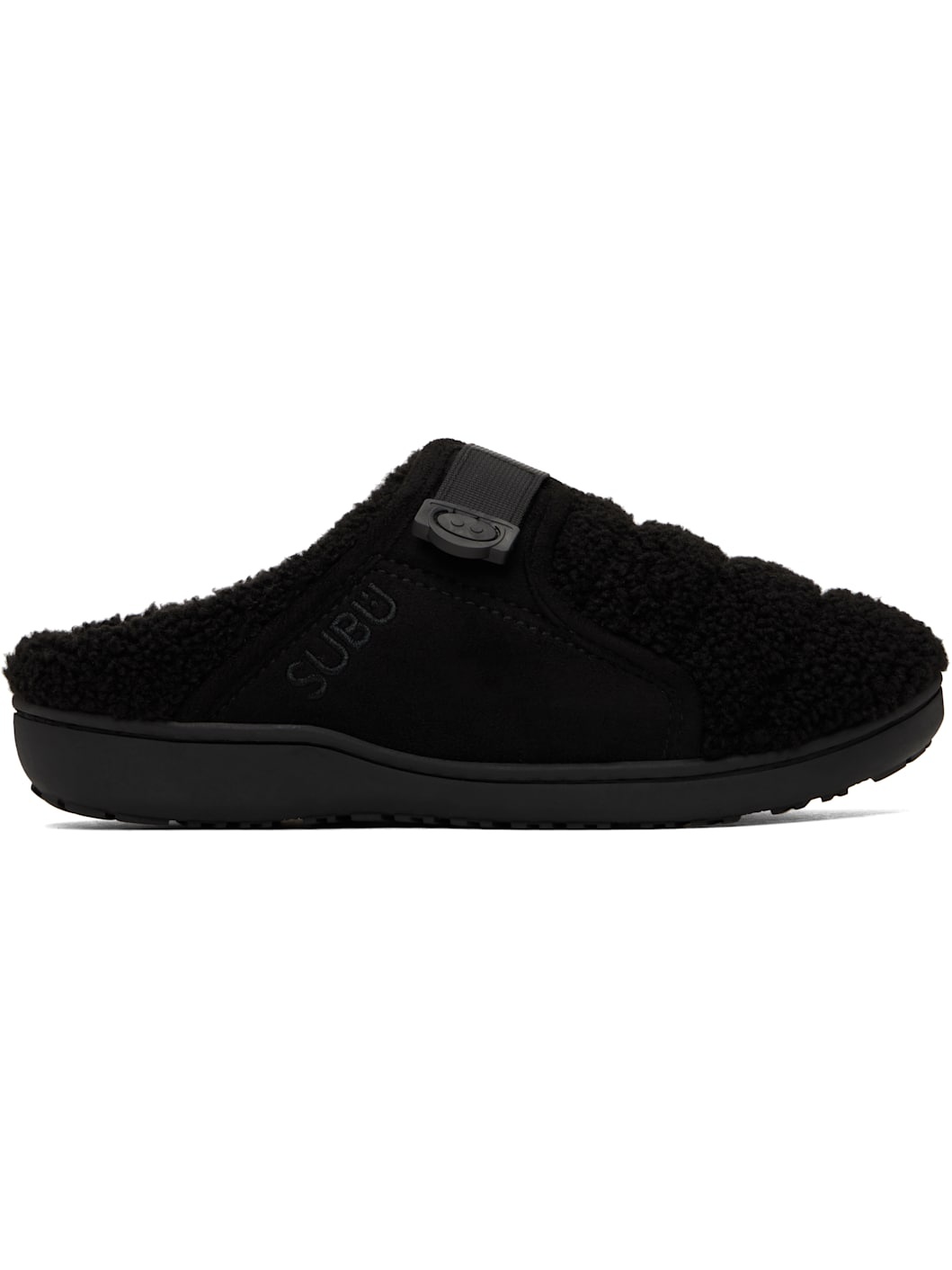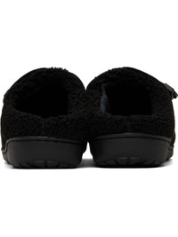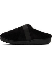 Quilted sherpa fleece and faux-suede slippers in black. · Velcro strap at vamp · Logo embroidered at outer side · Padded footbed · Fleece lining · Treaded non-slip rubber sole Part of the A.P.C. x SUBU collaboration. Supplier color: Black