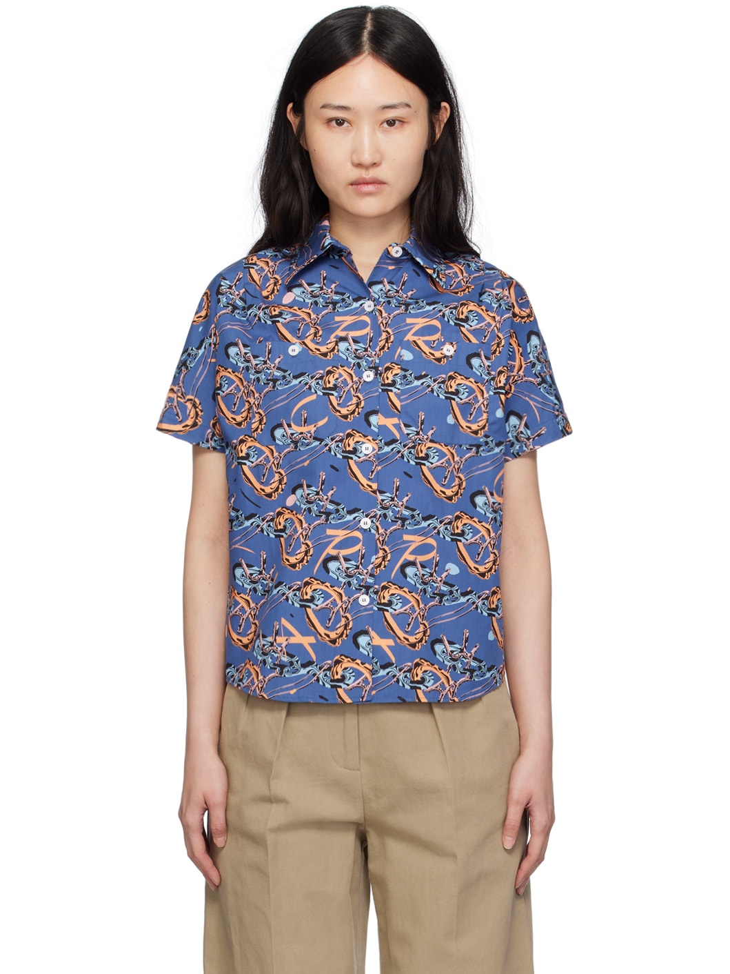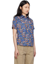 Cotton poplin shirt. Graphic pattern printed throughout. · Spread collar · Button closure · Patch pockets · Shirttail hem Part of the A.P.C. x Brain Dead collaboration. Supplier color: Blue 100% cotton. Made in Tunisia 241252F109015