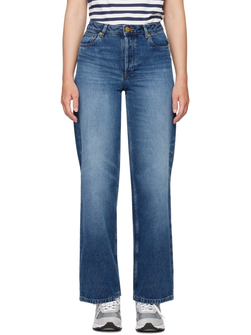 Wide straight-leg stonewashed and non-stretch organic cotton denim jeans. Fading and whiskering throughout. · High-rise · Five-pocket styling · Button-fly · Logo-engraved gold-tone hardware · Contrast stitching in tan Supplier color: Stonewashed indigo 100% organic cotton. Made in Egypt 242252F069006