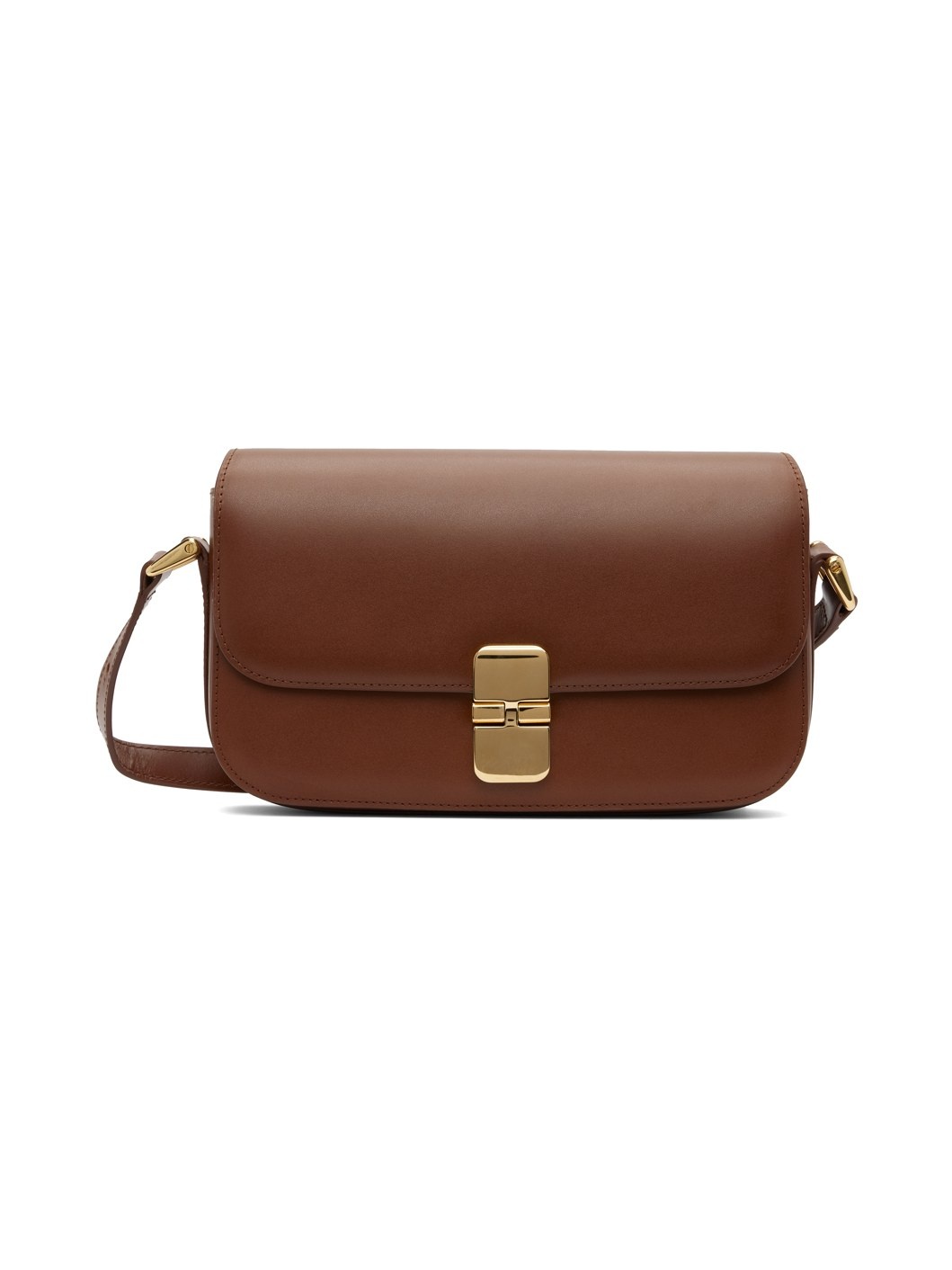 Buffed leather shoulder bag in brown. · Adjustable shoulder strap · Logo stamp at back face · Foldover flap with tab-slot fastening · Patch pocket at interior · Twill and suede lining · H6 x W9.5 x D1.75 in Supplier color: Cad hazelnut