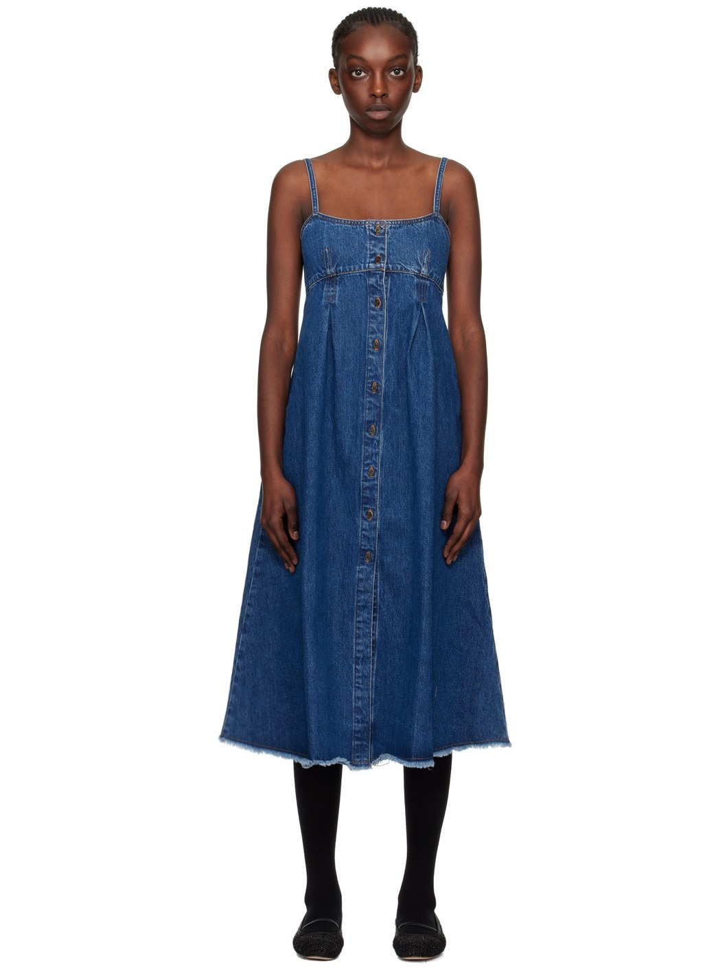 Stonewashed non-stretch denim dress. Subtle fading throughout. · Square neck · Button closure · Darts at chest · Inverted box pleats at front and back · Frayed edge at flared hem · Seam pockets · Contrast stitching in tan Supplier color: Washed indigo 100% cotton. Made in Egypt 241252F054001