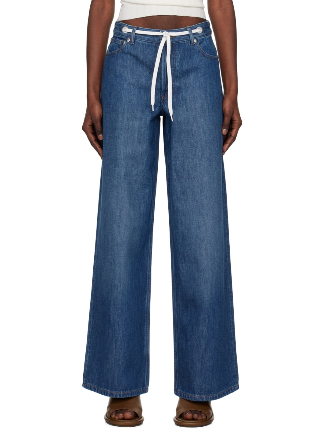 Loose-fit and flared stonewashed non-stretch organic cotton denim jeans. Subtle fading throughout. · High-rise · Belt loops · Drawstring at waistband · Five-pocket styling · Button-fly · Logo-engraved silver-tone hardware · Contrast stitching in tan Part of the A.P.C. x Natacha Ramsay-Levi collaboration. Supplier color: Washed indigo 100% organic cotton. Made in Portugal 241252F069017