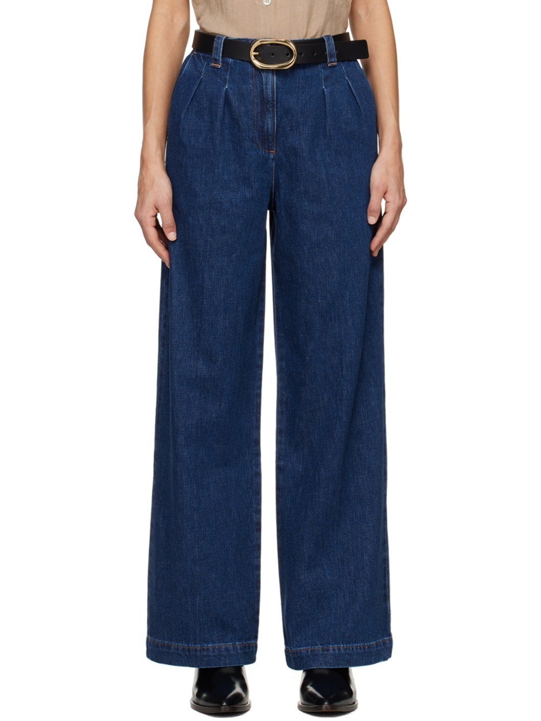 Wide-leg non-stretch denim jeans. Fading throughout. · High-rise · Belt loops · Three-pocket styling · Zip-fly · Pleats at front · Creased legs · Contrast stitching in orange Supplier color: Washed indigo 100% cotton. Made in Viet Nam 241252F069012