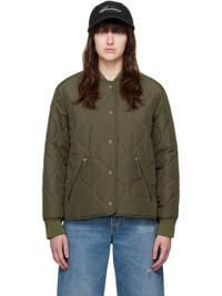 Insulated quilted polyester sateen bomber jacket. · Rib knit stand collar and cuffs · Press-stud closure · Zip pockets · Droptail hem · Logo flag at side seam · Full taffeta lining Supplier color: Military khaki Body: 100% polyester. Trim: 47% virgin wool, 47% acrylic, 6% elastane. Fill: 100% polyester. Lining: 100% polyester. Made in Romania 242252F063000
