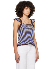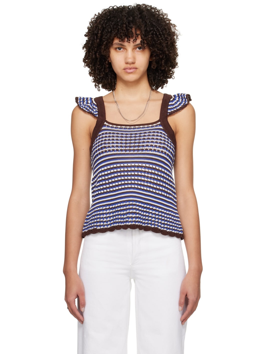 Semi-sheer crocheted cotton tank top. Ruffles, scalloped edges, rib knit trim, and stripes throughout. · Square neck · Cap sleeves Supplier color: Brown 100% cotton. Made in Romania 241252F111006