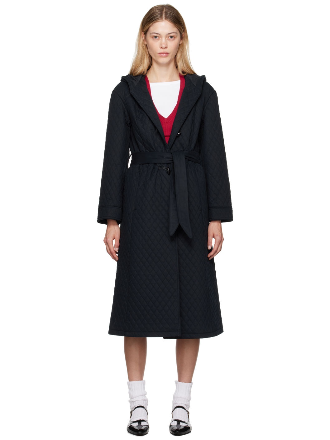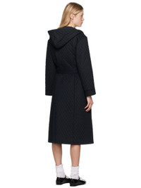 Padded diamond-quilted cotton broadcloth coat. Piping throughout. · Hood at collar · Toggle closure · Gathering at waist · Detachable self-tie belt and belt loops · Patch pockets · Flared hem · Full cotton poplin lining Part of the A.P.C x Katie Holmes collaboration. Supplier color: Dark navy Body: 100% cotton. Fill: 100% polyester. Lining: 100% cotton. Made in Romania 242252F059004
