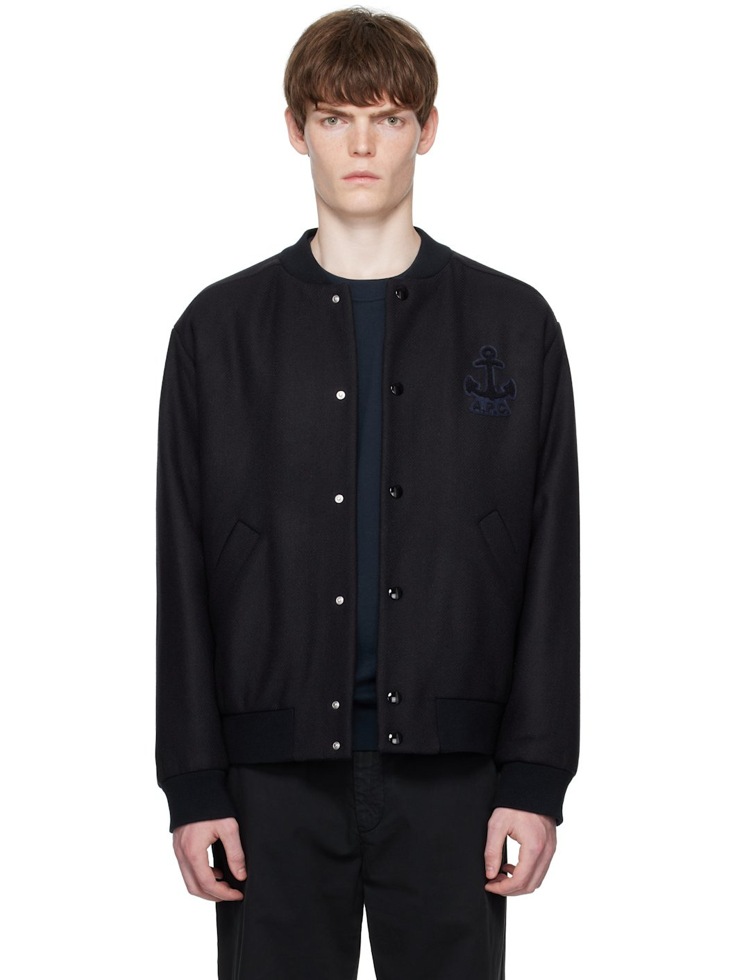 Wool- and nylon-blend serge bomber jacket. · Rib-knit stand collar, hem, and cuffs · Press-stud closure · Logo graphic patch at chest · Welt pockets at waist · Welt pocket at interior · Viscose satin lining Supplier color: Dark Navy Body: 75% wool, 25% polyamide. Trim: 62% acrylic, 34% wool, 4% polyamide. Fill: 100% polyester. Lining: 100% viscose. Made in Romania 252252M175001