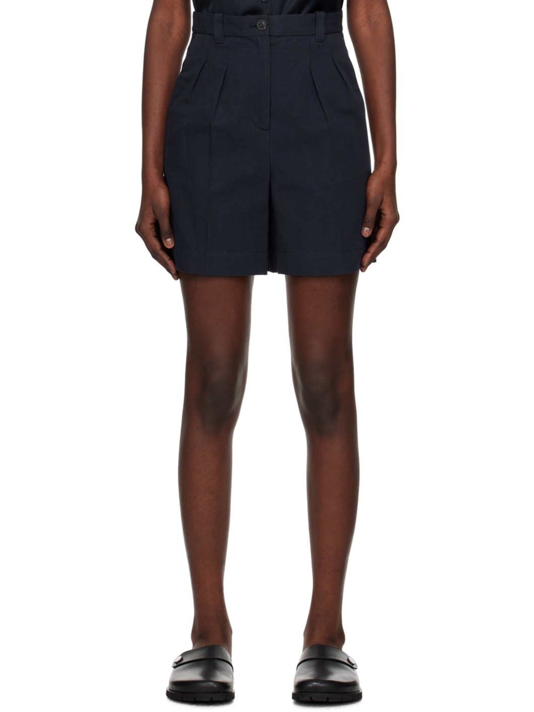 Cotton- and linen-blend canvas shorts. · High-rise · Belt loops · Three-pocket styling · Zip-fly · Pleats at front waistband · Creased legs Supplier color: Dark navy 76% cotton, 24% linen. Made in Romania 241252F088004