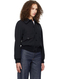 Stretch cotton- and wool-blend twill bomber jacket. · Spread collar · Button closure · Flap pockets at front · Rib-knit hem and cuffs · Raglan sleeves · Welt pocket at interior · Fully lined Supplier color: Dark navy Body: 44% cotton, 30% polyester, 24% wool, 2% elastane. Trim: 50% wool, 50% acrylic. Lining 1: 100% cotton. Lining 2: 100% viscose. Made in Bulgaria 261252F058000