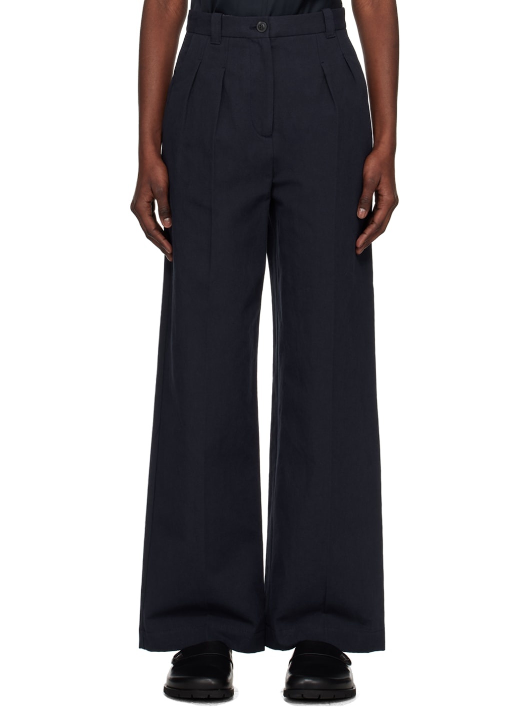 Wide-leg cotton- and linen-blend canvas trousers. · High-rise · Belt loops · Three-pocket styling · Zip-fly · Pleats at front waistband · Creased legs Supplier color: Dark navy 76% cotton, 24% linen. Made in Romania 241252F087003