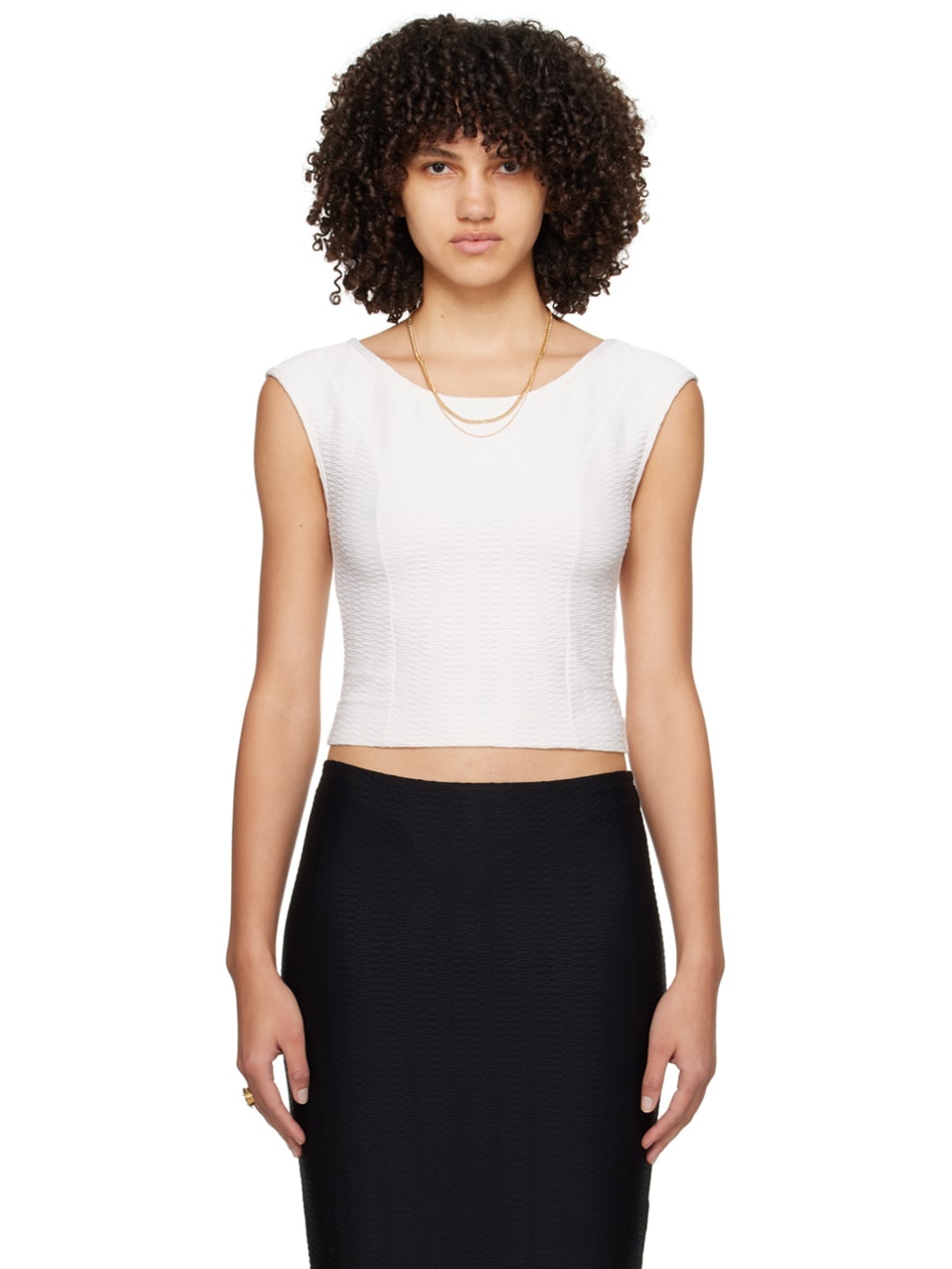 Textured stretch nylon jersey T-shirt. · Boat neck · Cap sleeves Supplier color: Ecru 83% polyamide, 17% elastane. Made in Portugal 241252F110028
