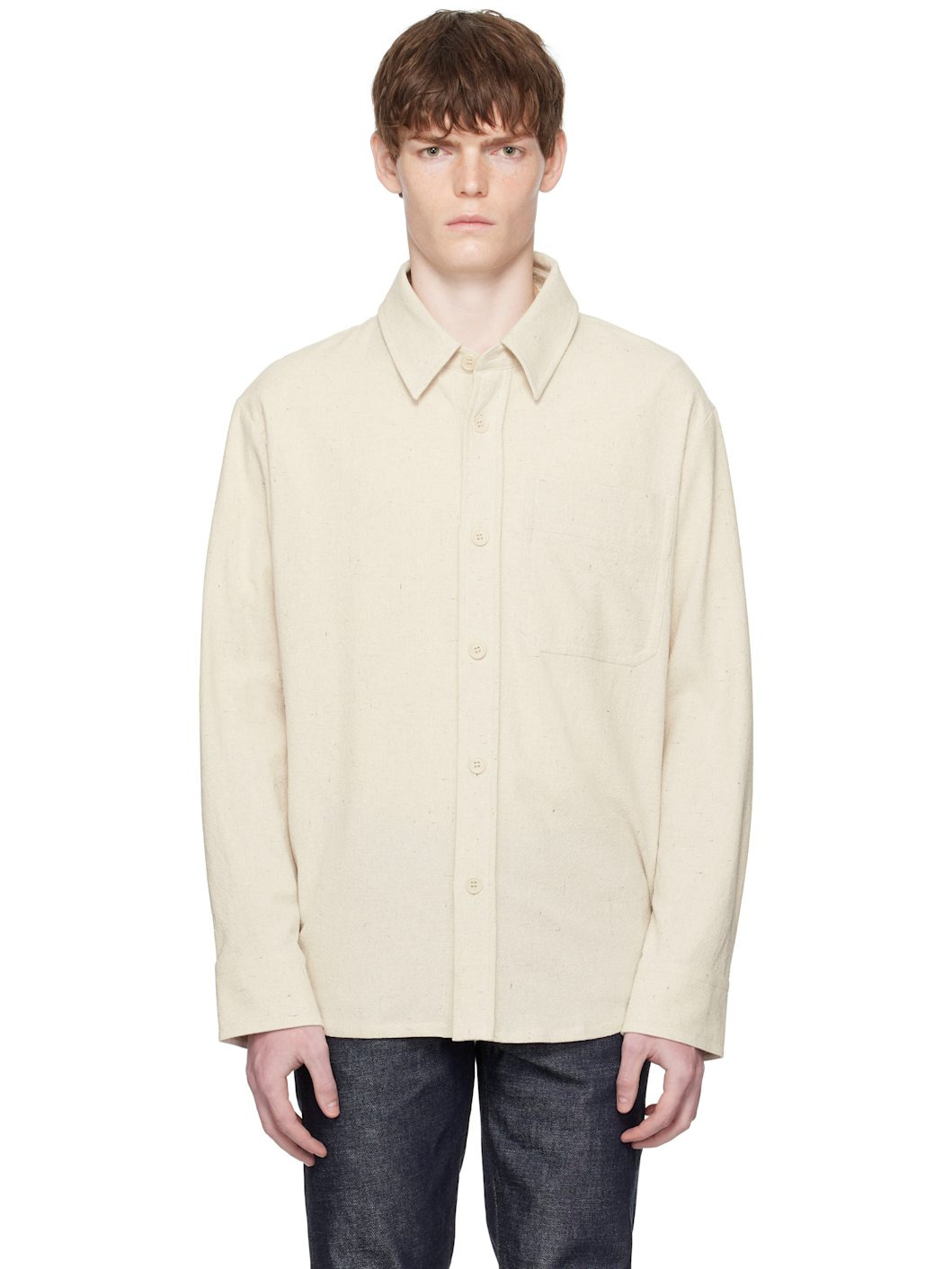 Plain-woven recycled cotton overshirt. · Spread collar · Button closure · Logo embroidered at patch pocket · Shirttail hem · Dropped shoulders · Buttoned barrel cuffs · Locker loop at back yoke Supplier color: Ecru 95% cotton, 5% other fibers. Made in Morocco 252252M192030