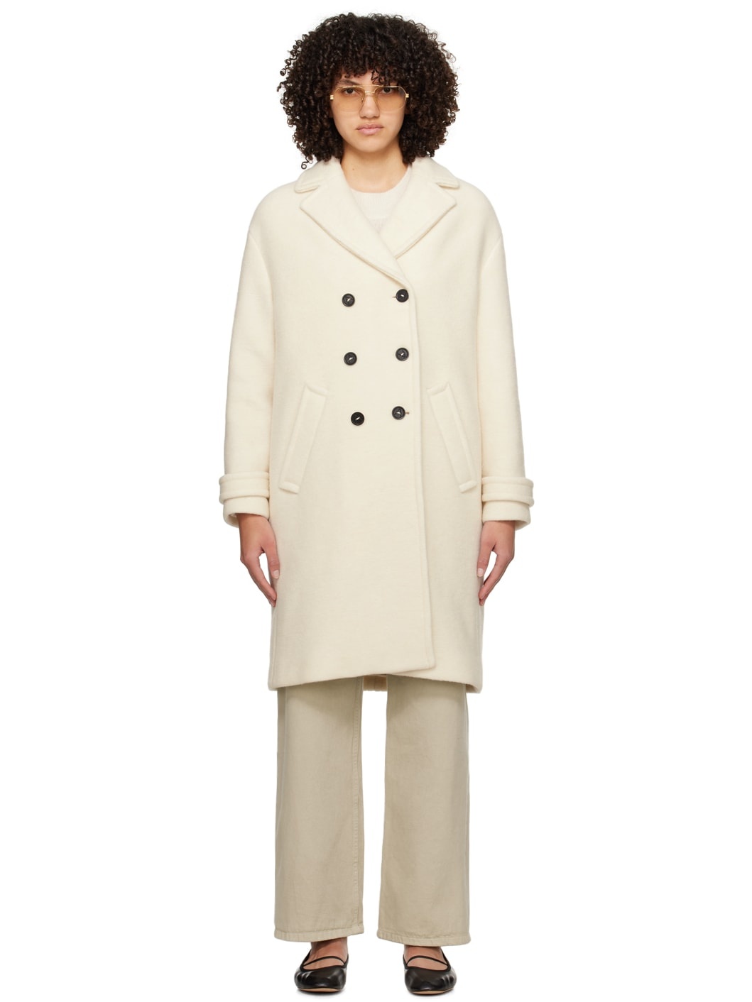 Wool- and polyester-blend melton coat. · Notched lapel · Double-breasted button closure · Welt pockets · Adjustable button tab at cuffs · Patch pocket at interior · Full twill lining Supplier color: Ecru Body: 58% wool, 42% polyester. Lining: 100% viscose. Made in Romania 241252F063011