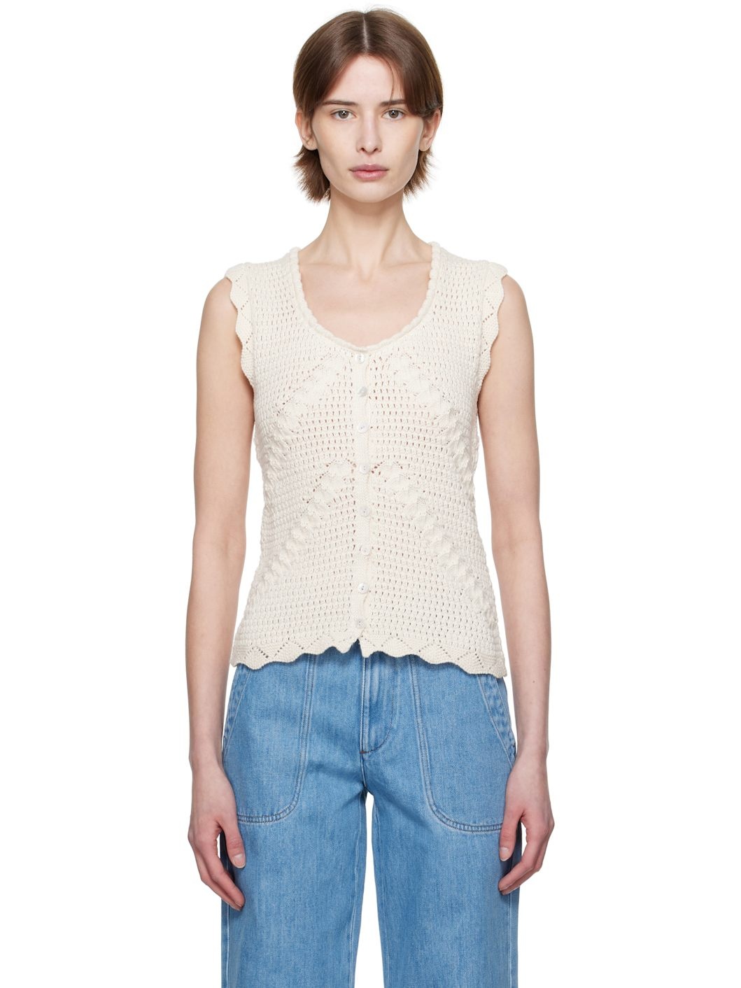 Crocheted cotton top. · Scoop neck · Button closure · Scalloped edge at hem Supplier color: Off white 100% cotton. Made in China 251252F111003