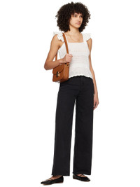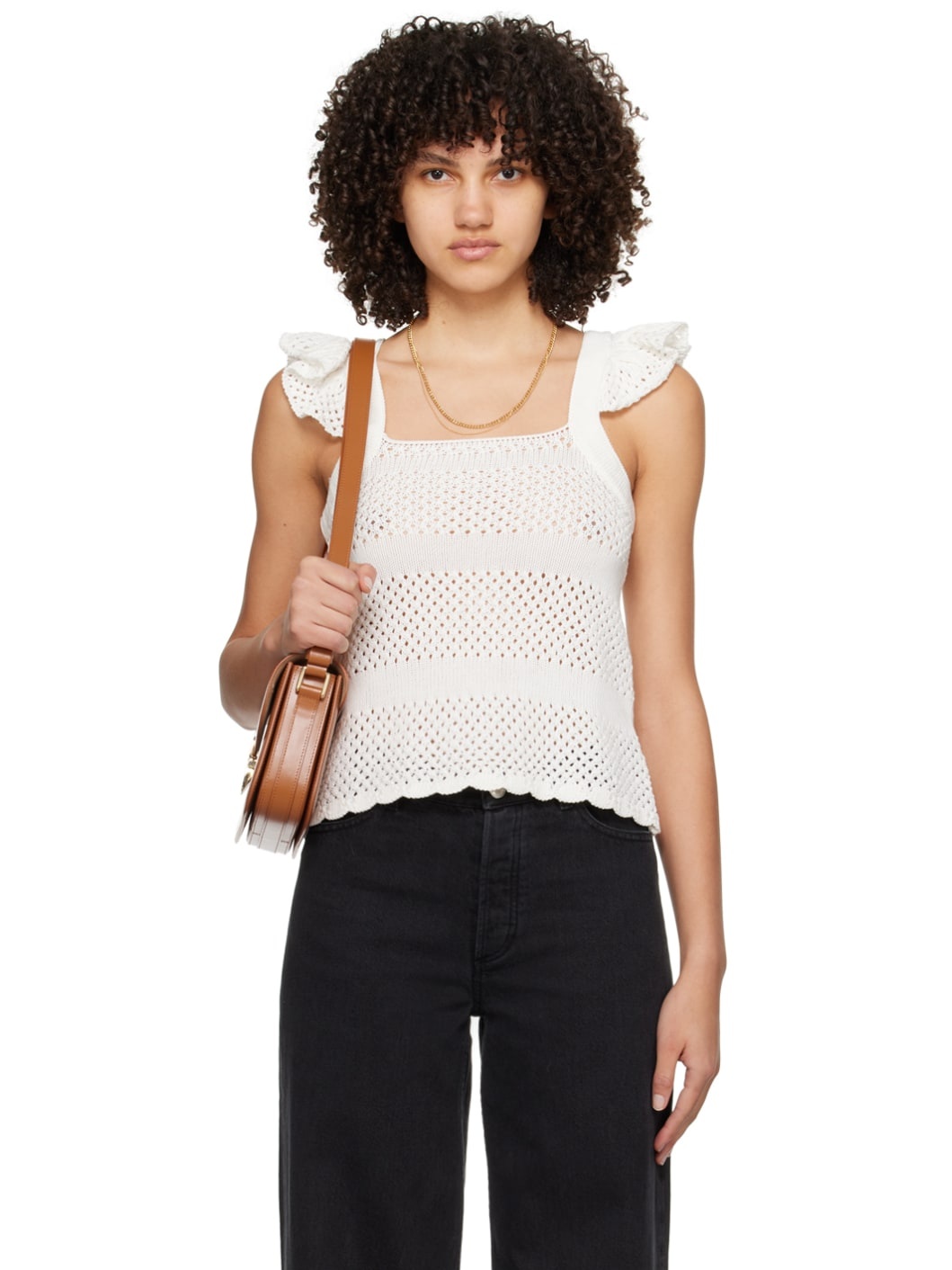 Semi-sheer crocheted cotton tank top. Ruffles, rib knit trim, and scalloped edges throughout. · Square neck · Cap sleeves Supplier color: White 100% cotton. Made in Romania 241252F111005