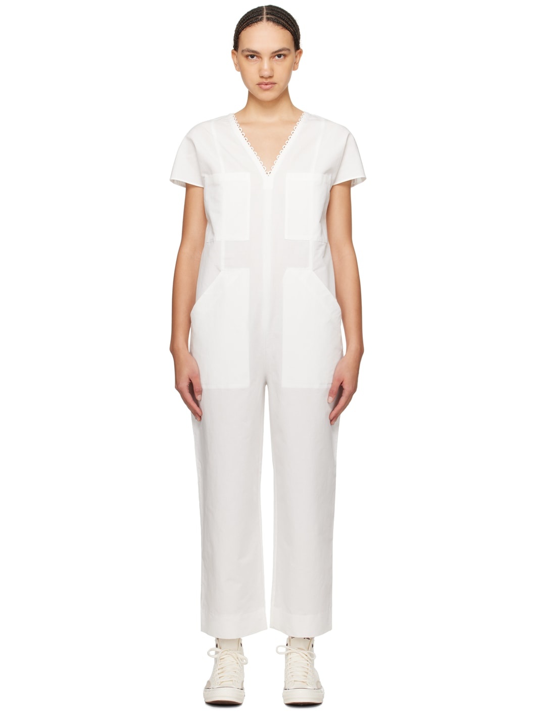 Plain-woven cotton- and linen-blend jumpsuit. · Scalloped trim at V-neck · Patch pockets at chest · Two-pocket styling · Concealed zip closure at back Supplier color: Off white 74% cotton, 26% linen. Made in Bulgaria 241252F070001