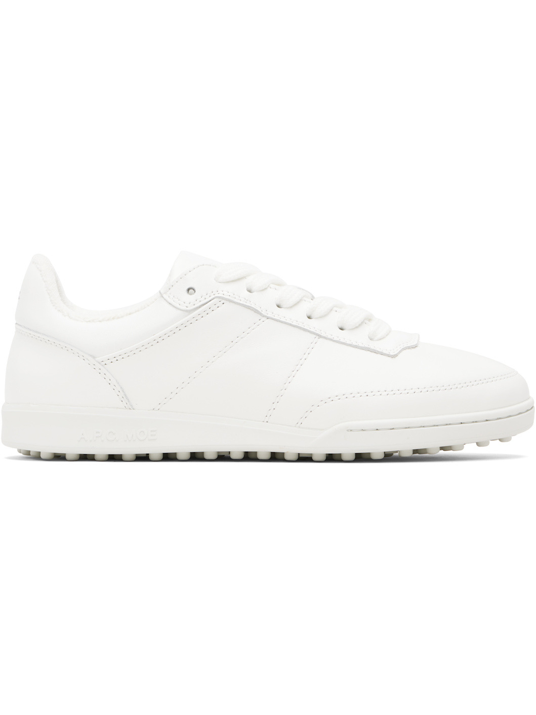 Low-top buffed leather sneakers. · Topstitching throughout · Lace-up closure · Padded tongue and collar · Logo stamp at heel tab · Eyelets at inner side · Terrycloth lining · Logo embossed at rubber midsole · Treaded rubber sole Supplier color: White Upper: leather. Sole: rubber. Made in Portugal 252252F128001