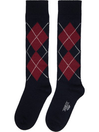 Pair of knee-high knit cashmere socks. · Intarsia argyle pattern throughout · Rib-knit cuffs · Logo printed at sole Available exclusively at SSENSE. Supplier color: Maroon argyle 100% cashmere. Made in China 261449F076001