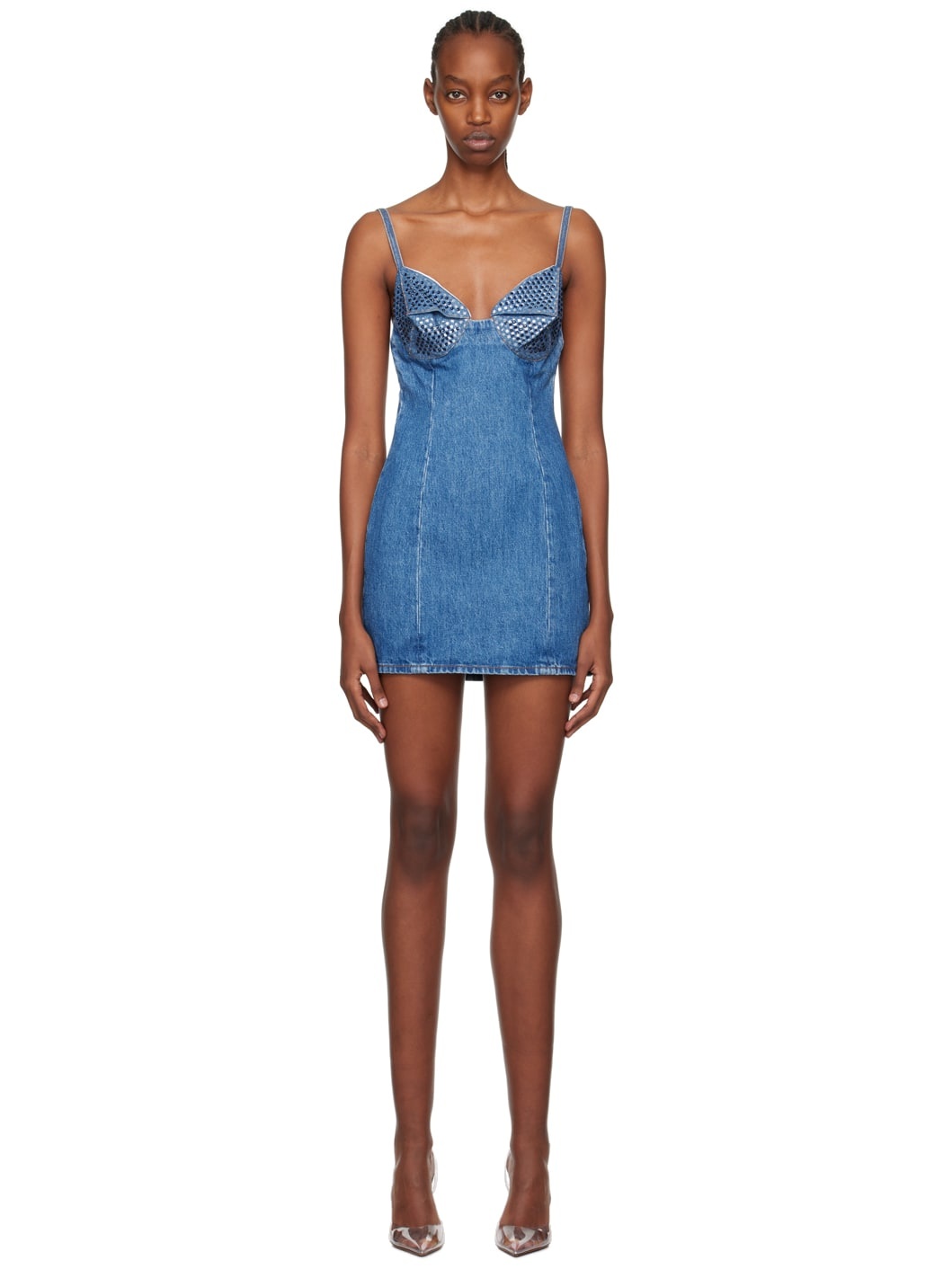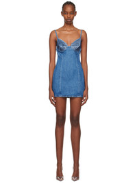 Non-stretch denim dress. Fading throughout. · Sweetheart neck · Crystal-cut detailing at chest · Adjustable spaghetti straps · Concealed zip closure at back · Contrast stitching in tan Supplier color: Medium indigo 100% cotton. Made in Italy 241372F052010