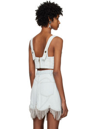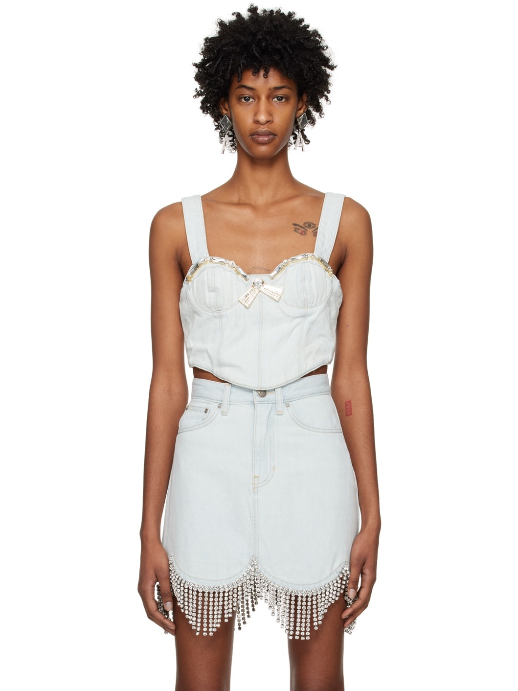Non-stretch cotton- and recycled cotton-blend denim camisole. Fading throughout. · Sweetheart neck · Crystal-cut detailing and bow accents at front · Adjustable shoulder straps · Zip closure at back · Full cotton twill lining · Logo-engraved antiqued gold-tone hardware · Contrast stitching in gold Supplier color: Pale blue Body: 86% cotton, 14% recycled cotton. Lining: 100% cotton. Made in Turkey 231372F111005