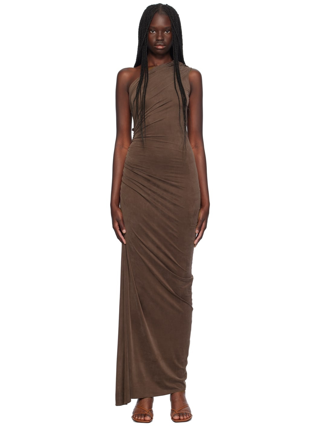 Sand-washed stretch cupro jersey dress. Ruching and ruffled trim throughout. · Single-shoulder construction · Asymmetric hem Supplier color: Sepia 93% cupro, 7% elastane. Made in France 242302F055009