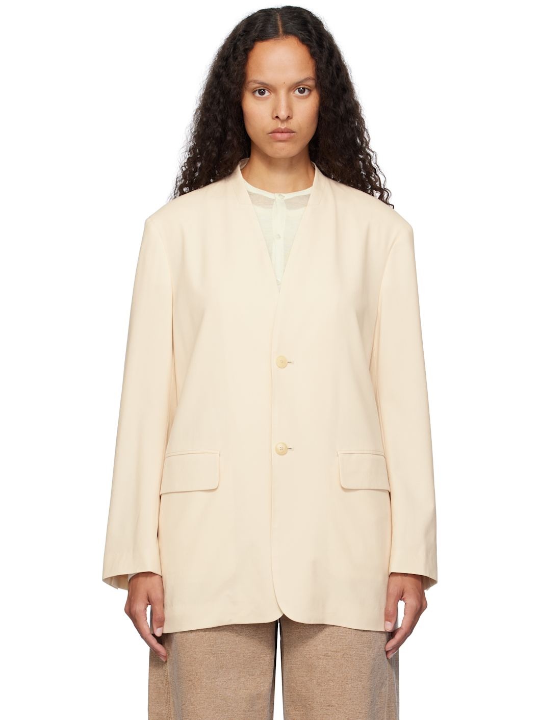 Relaxed-fit plain-woven Super 180s wool blazer. · Y-neck · Button closure · Flap pockets · Button vent at cuffs · Cupro sateen lining Supplier color: Ivory beige Body: 100% wool. Lining: 100% cupro. Made in Japan 242484F057003