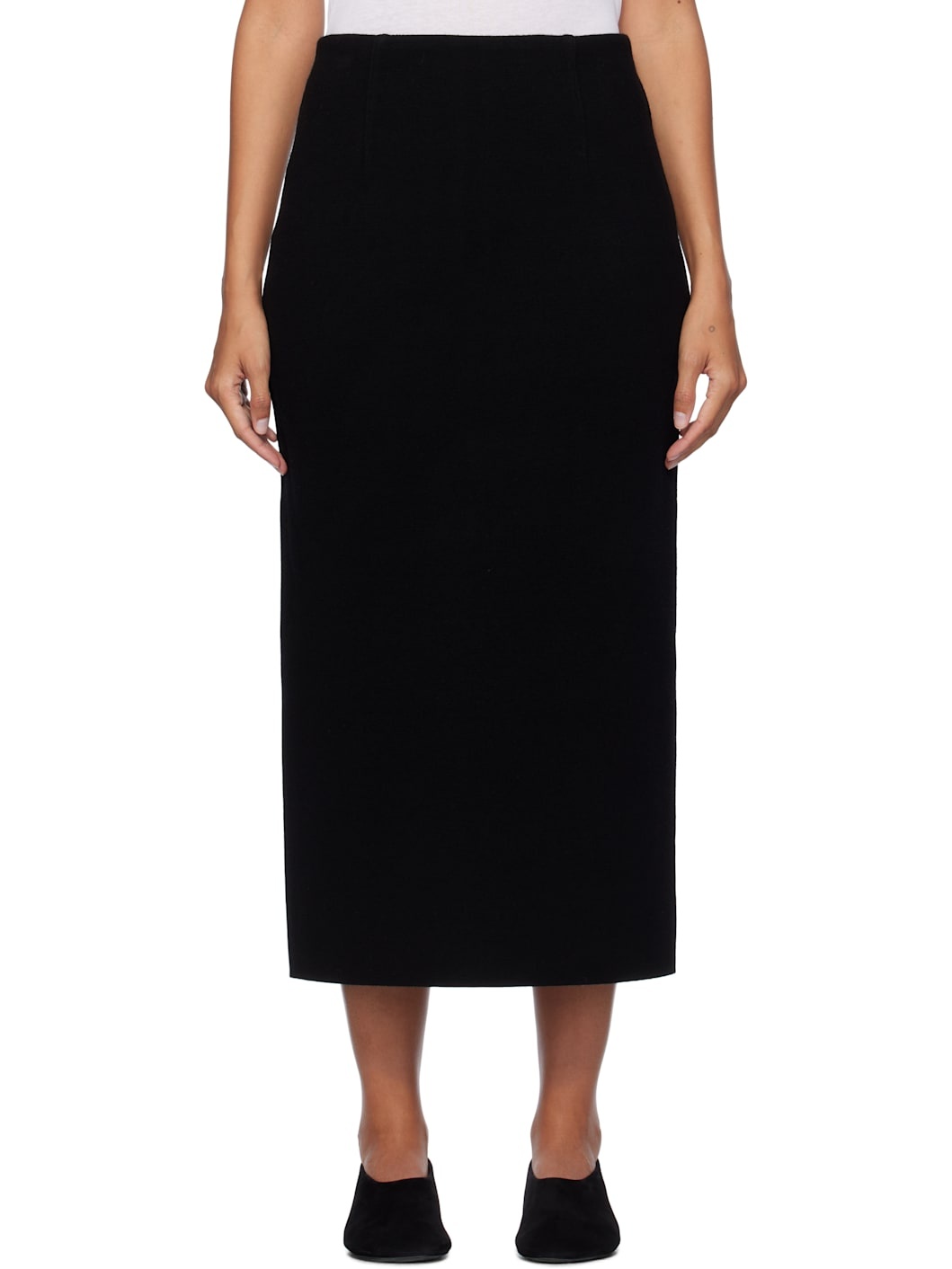 Heavyweight Milano rib-knit stretch wool-blend midi skirt. · Darts at waist · Zip closure at back · Central vent at back hem · Unlined Supplier color: Black 93% wool, 6% nylon, 1% polyurethane. Made in Japan 251484F092003