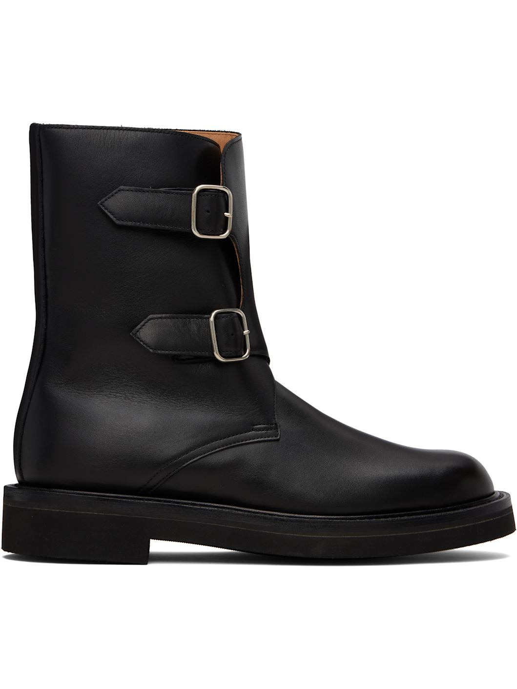 Mid-calf buffed calfskin boots. · Pin-buckle tabs at outer side · Buffed calfskin lining · Textured rubber sole Supplier color: Black Upper: calfskin. Sole: rubber. Made in Japan 252484F113000