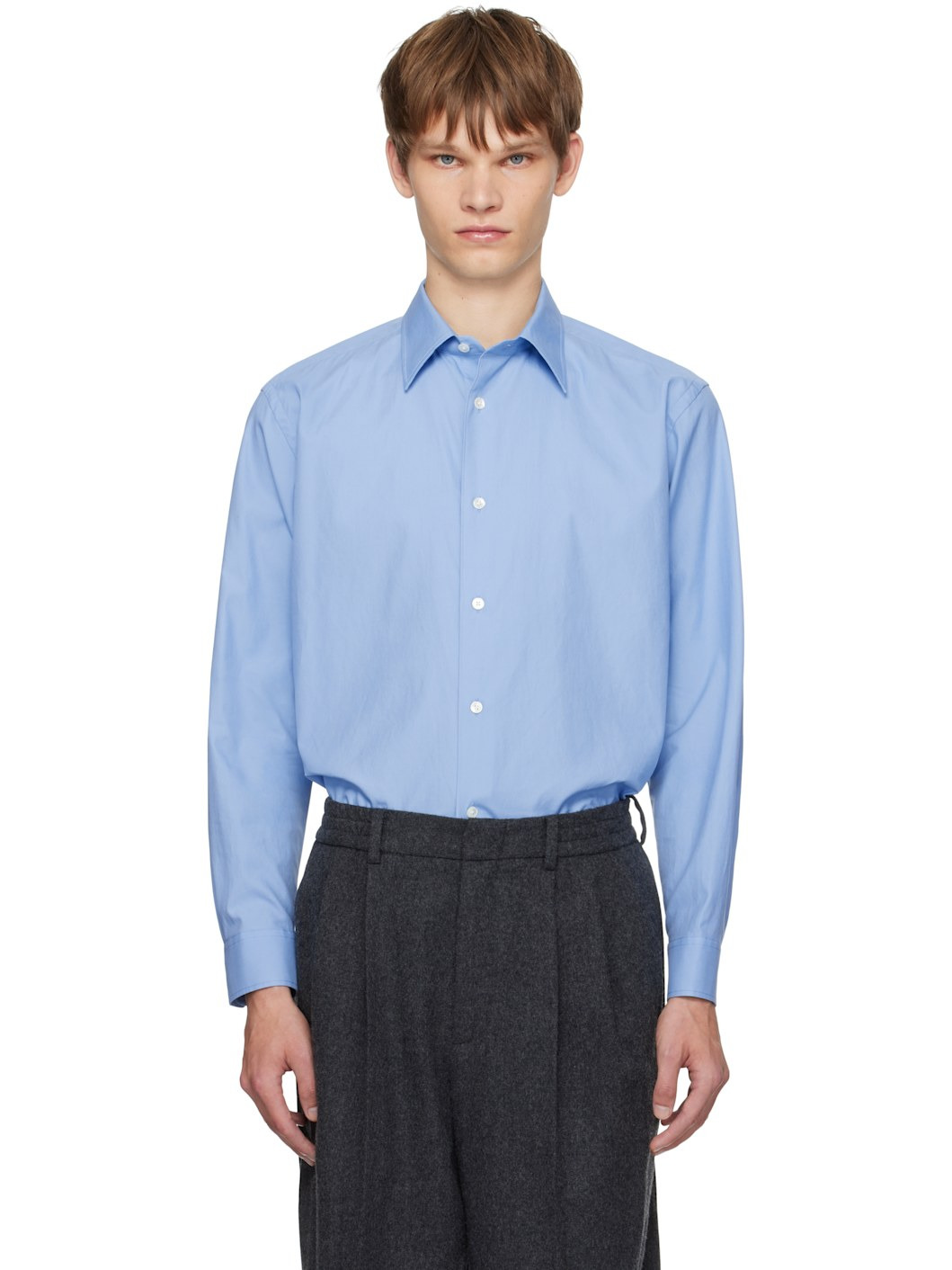Washed extra-long staple Finx cotton twill shirt. · Spread collar · Button closure · Shirttail hem · Buttoned barrel cuffs · Twin pleats at back yoke · Mother-of-pearl hardware Supplier color: Blue 100% cotton. Made in Japan 252484M192021