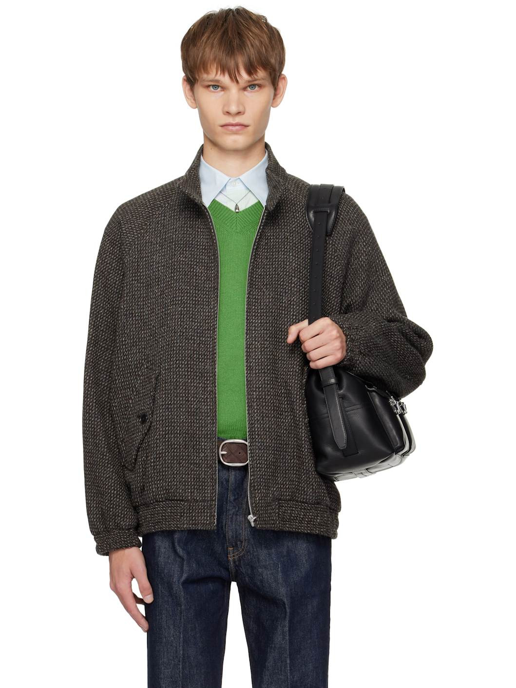 Lightweight wool- and alpaca-blend tweed jacket. · Button fastening at stand collar · Zip closure · Flap pockets at waist · Elasticized hem and cuffs · Raglan sleeves · Welt pocket at interior · Full satin lining Supplier color: Gray brown hairline Body: 60% wool, 25% alpaca, 15% silk. Lining: 100% cupro. Made in Japan 252484M180006