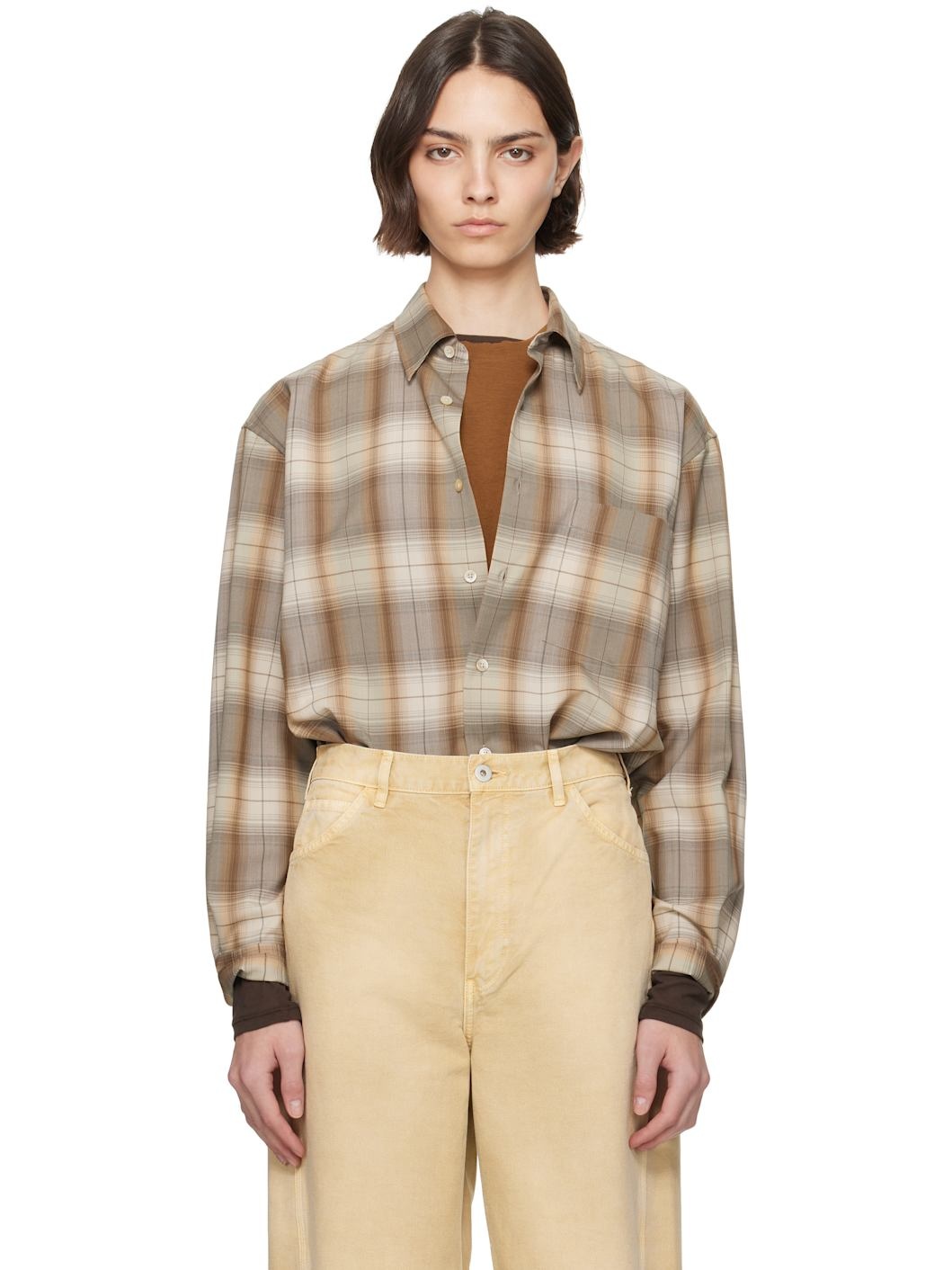 Super 120s wool oxford cloth shirt. Check pattern throughout. · Spread collar · Button closure · Patch pocket at chest · Droptail hem · Buttoned barrel cuffs · Twin pleats at back yoke · Mother-of-pearl hardware Supplier color: Gray brown check 100% wool. Made in Japan 252484F109003