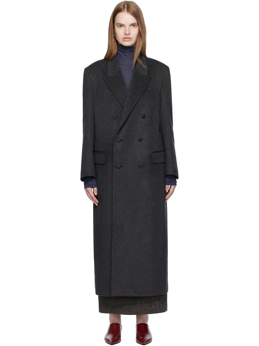 Brushed cashmere moleskin coat. · Peaked lapel · Double-breasted button closure · Welt pocket at chest · Flap pockets at waist · Surgeon's cuffs · Central vent at back hem · Welt pocket at interior · Full satin lining Supplier color: Top charcoal Body: 100% cashmere. Lining: 100% cupro. Made in Japan 252484F059000