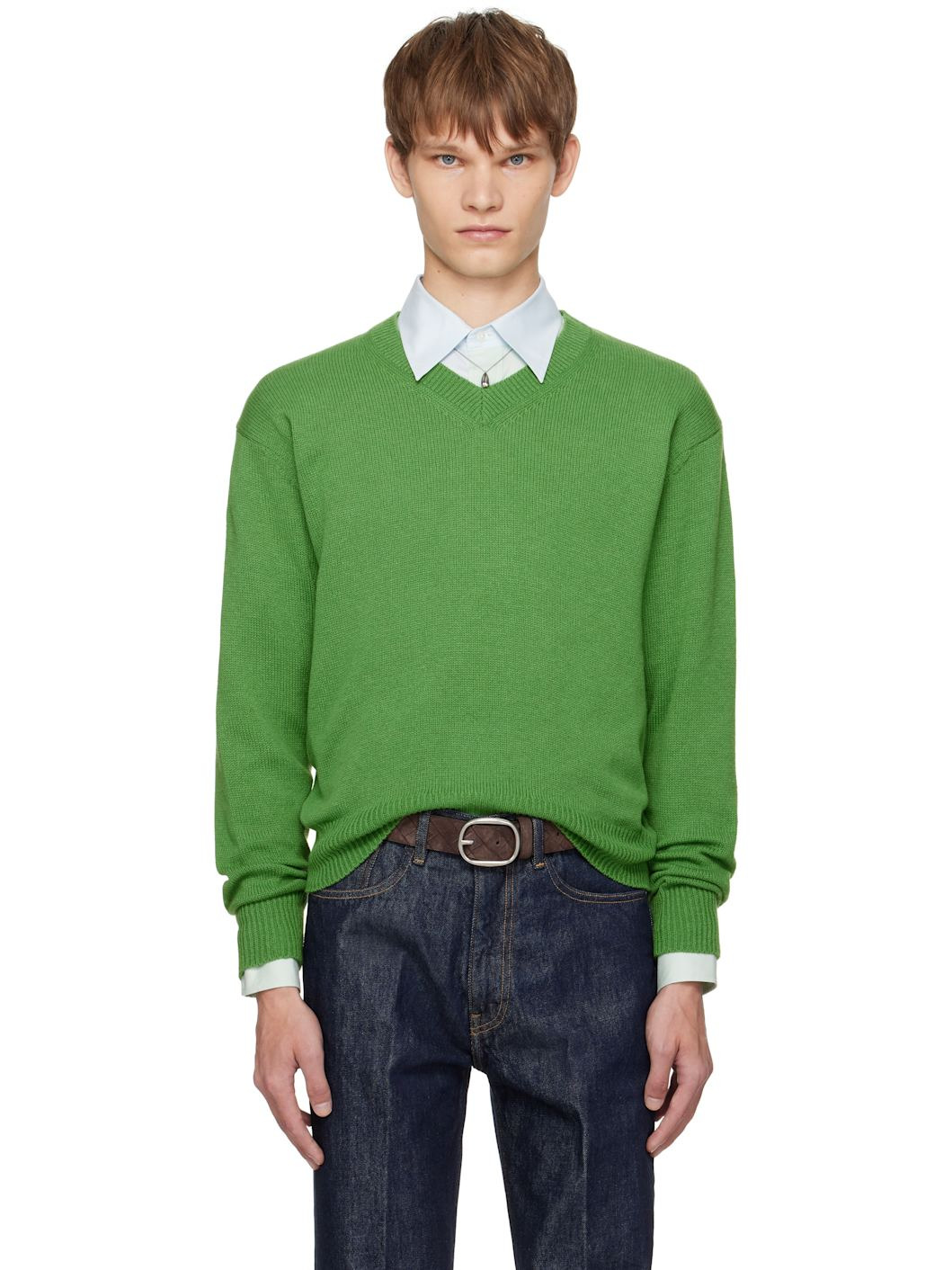 Lightweight knit cashmere sweater. · Rib-knit V-neck, hem, and cuffs · Dropped shoulders Supplier color: Green 100% cashmere. Made in Japan 252484M206005