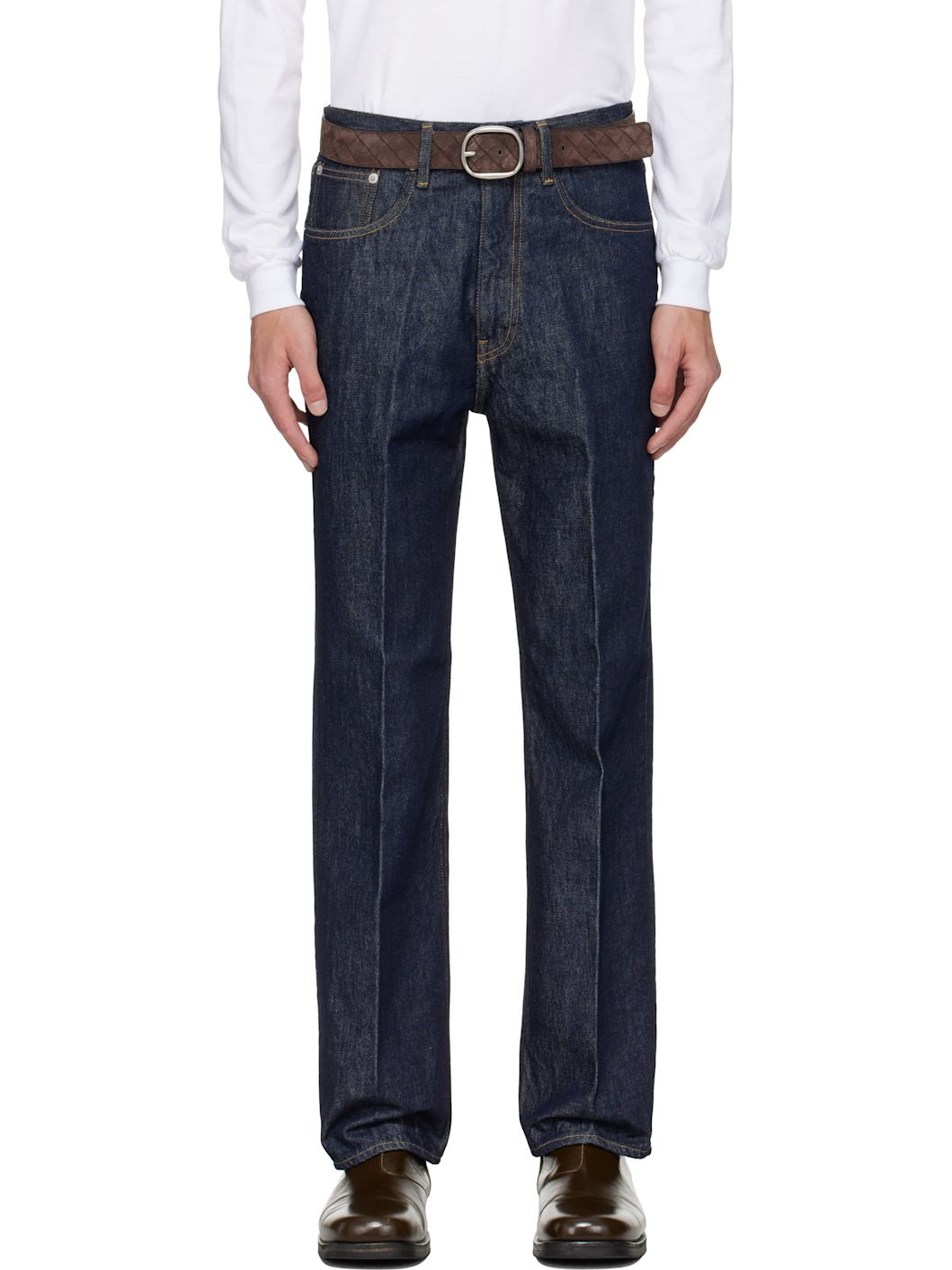 Indigo rope-dyed non-stretch denim jeans. · Straight-leg · Belt loops · Five-pocket styling · Zip fly · Creased legs · Logo-engraved silver-tone hardware · Contrast stitching in tan Supplier color: Indigo 100% cotton. Made in Japan 252484M186003