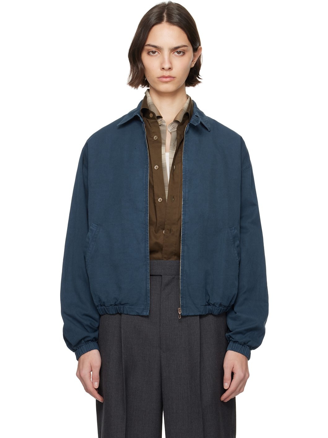 Handcrafted cotton gabardine jacket in navy. Fading throughout. · Garment-dyed · Button tab at spread collar · Zip closure · Welt pockets · Elasticized hem and cuffs · Dropped shoulders · Antiqued copper-tone hardware Supplier color: Dyed navy 100% cotton. Made in Japan 252484F063000
