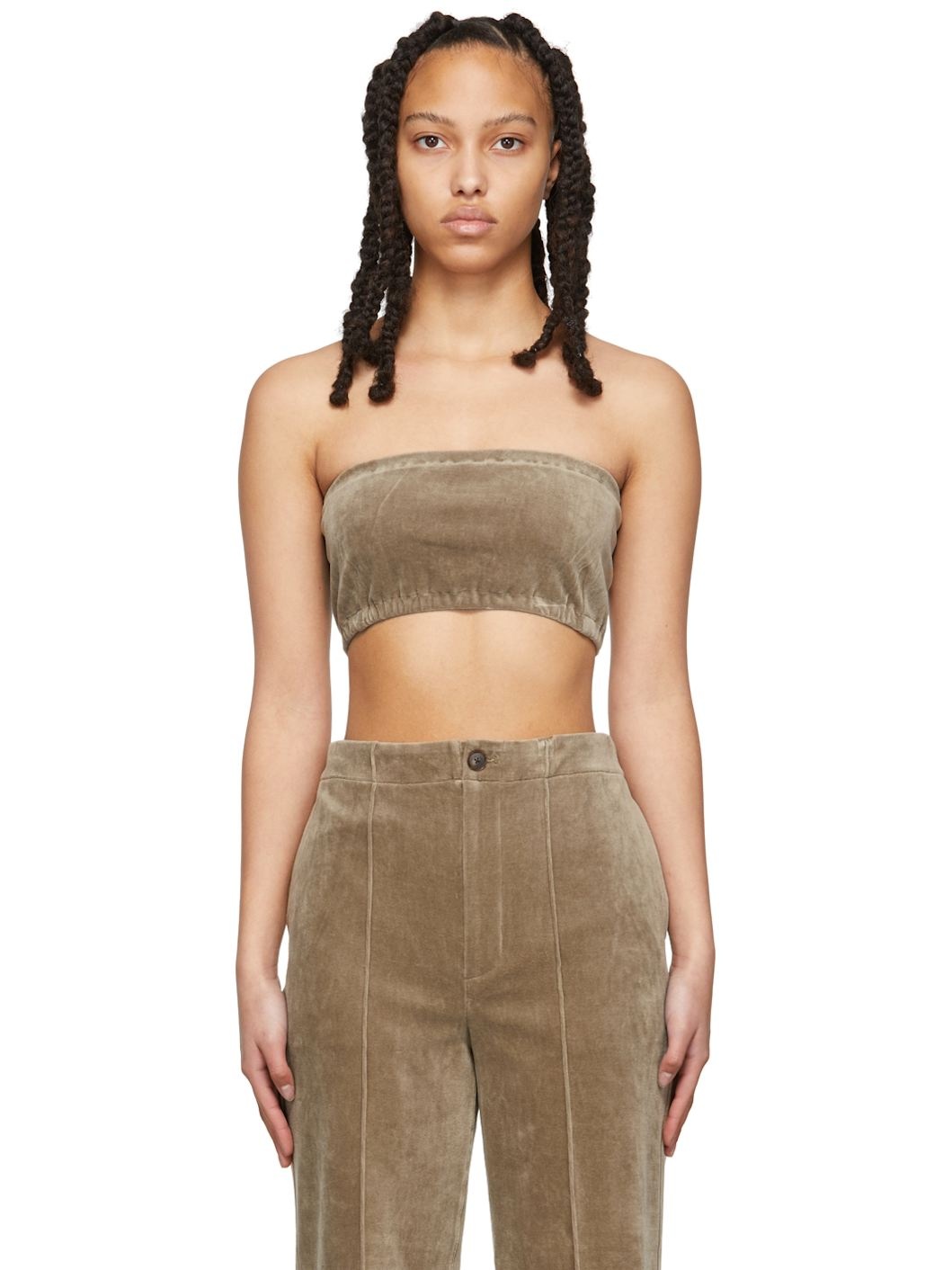 Strapless organic cotton velour bandeau-style camisole in taupe. · Elasticized collar and hem · Zip closure at back Supplier color: Light brown 100% organic cotton. Made in Japan 221484F111005