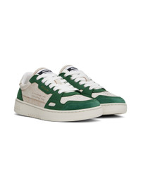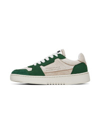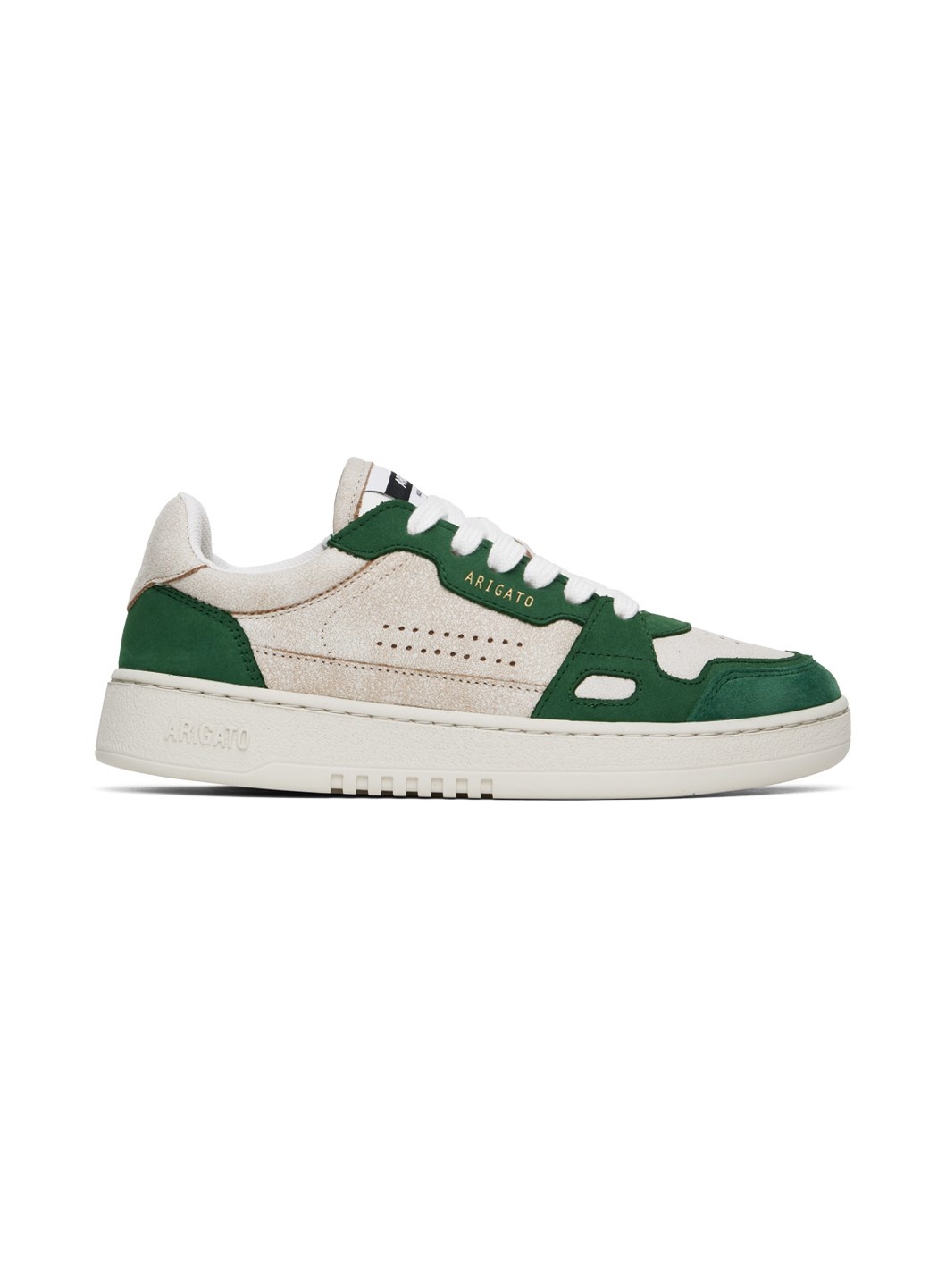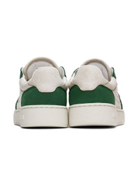 Handcrafted low-top buffed LWG-certified calfskin, calfskin suede, and canvas sneakers in beige and green. · Perforated detailing and subtle distressing throughout · Lace-up closure · Logo patch at padded tongue · Padded collar · Gold-tone logo stamp at outer side · Recycled mesh and faux-suede lining · Logo embossed at textured rubber midsole · Treaded rubber sole Supplier color: White/Kale green Upper: calfskin, textile. Sole: rubber, recycled rubber. Made in Portugal 242307F128008
