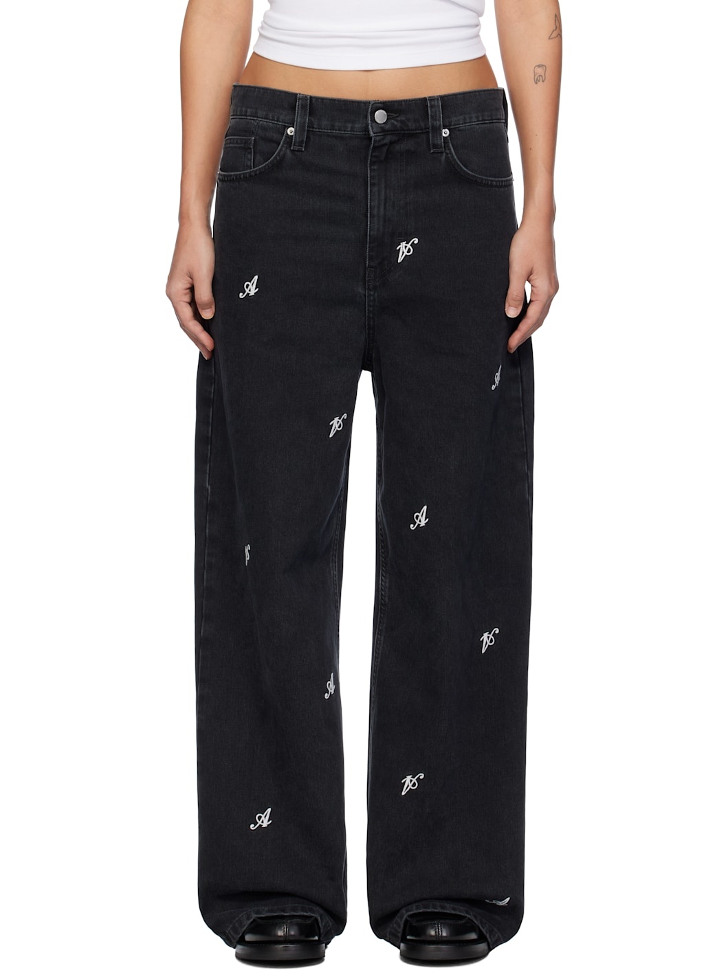 Relaxed-fit and wide-leg non-stretch denim jeans. Fading and embroidered logos throughout. · Belt loops · Five-pocket styling · Zip-fly · Leather logo patch at back waistband · Logo embroidered at back pocket · Logo-engraved silver-tone hardware Supplier color: Black 100% cotton. Made in Italy 242307F069001