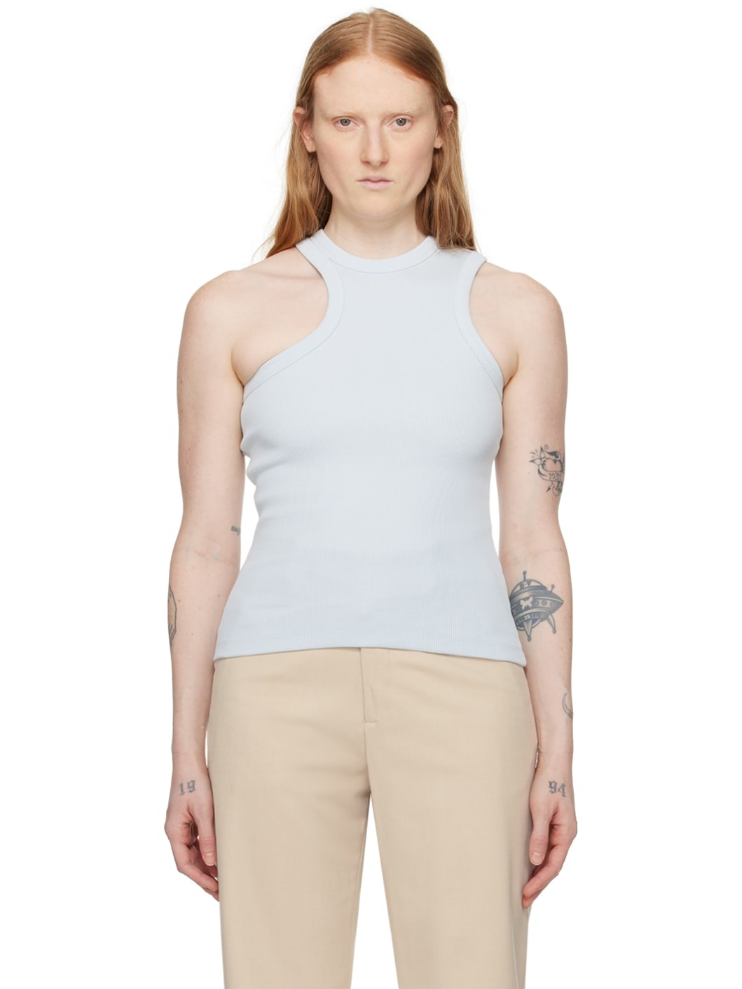 Stretch cotton ribbed jersey tank top. · Asymmetrical construction · Crewneck · Logo embroidered at back collar Supplier color: Light blue 98% cotton, 2% elastane. Made in Portugal 241307F111005