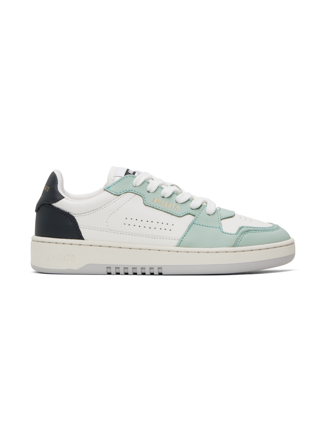 Handcrafted low-top LWG-certified buffed leather sneakers in off-white and green. · Perforated detailing throughout · Lace-up closure · Logo patch at padded SEAQUAL® YARN canvas tongue · Padded collar · Logo stamp at outer side and heel tab · Recycled mesh lining · Treaded rubber sole Supplier color: Beige/Mint Upper: leather. Sole: rubber. Made in Portugal 241307F128051